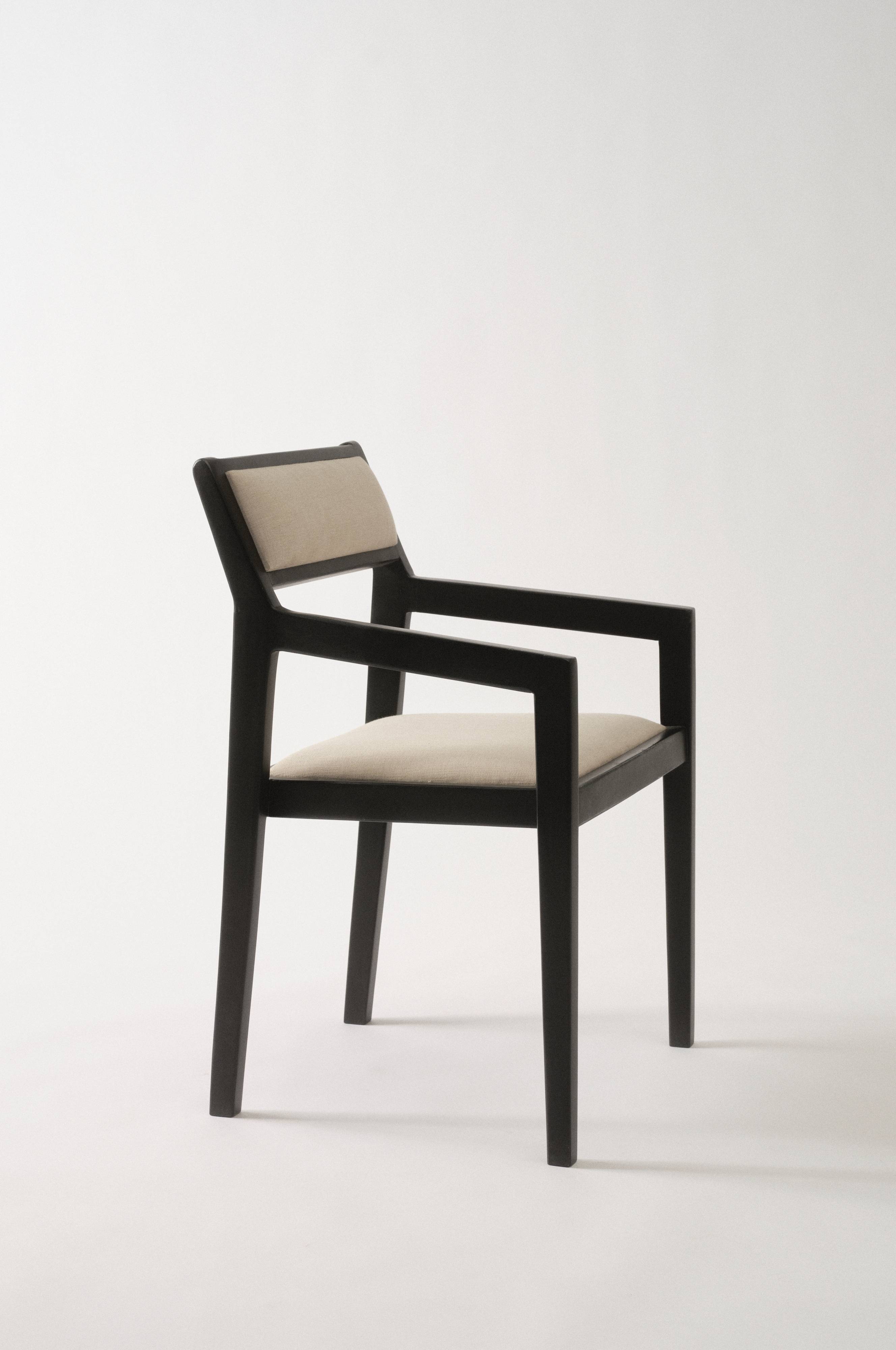 Handgjord karmstol av massiv mango med plywood i sitsen. Stolen har mjukstoppad sits och rygg som klätts med linnetyg. Designen är ren och avskalad med snygga vinklar i bästa kolonialstil. TOBA är ett fint hantverk som gör varje stol unik och karmstolen är lika snyggt i köket som i ditt vardagsrum. Tänk på att använda möbeltassar under stolsbenen. Det är extra viktigt om du placerar den mörka stolen på ljust golv eller en ljus matta, för att undvika missfärgning.
