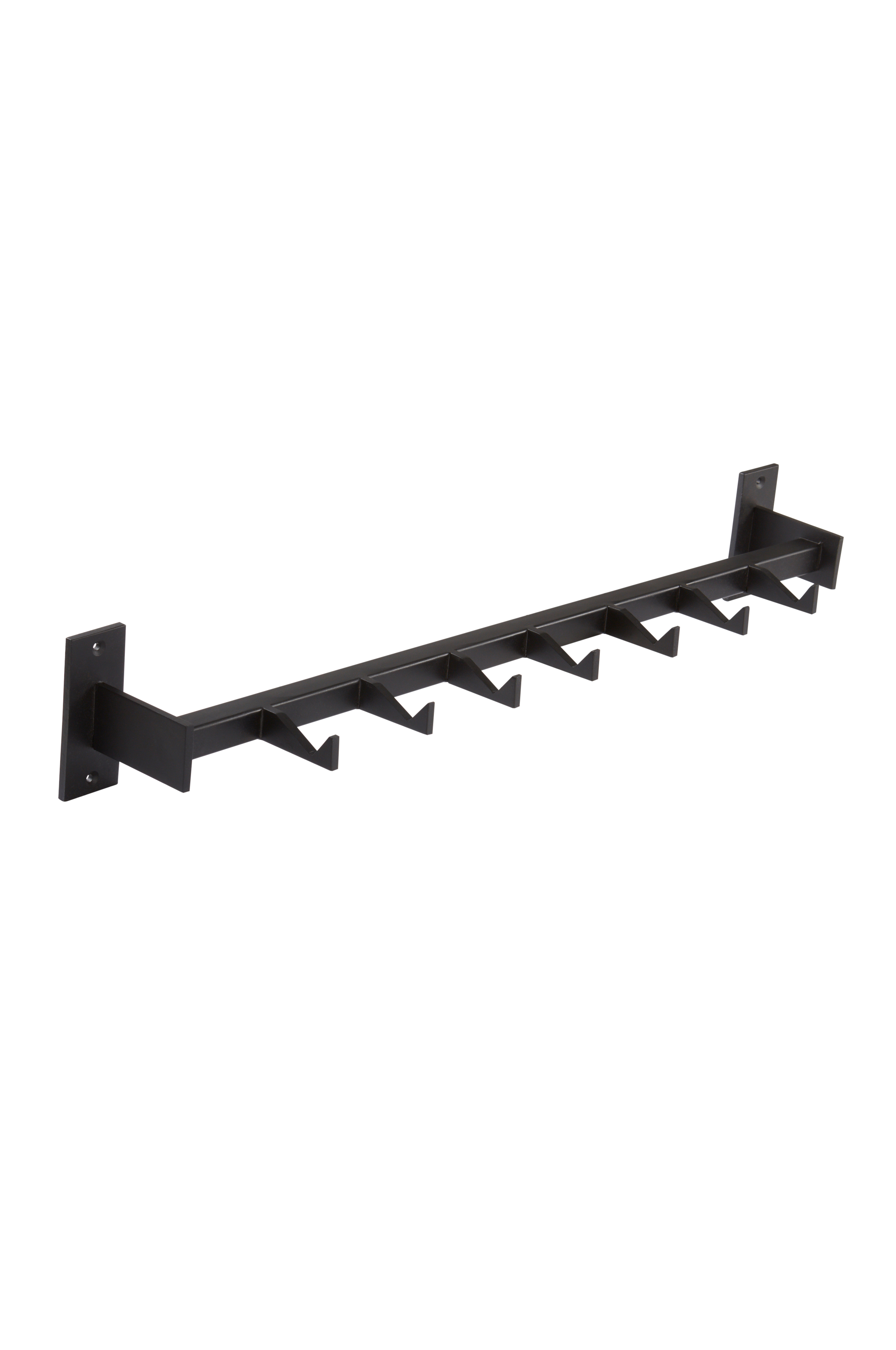 Hängare av mattsvart metall. Hängaren har sju kantiga krokar där frottén, plaggen och väskorna hänger kvar tack vare formen.