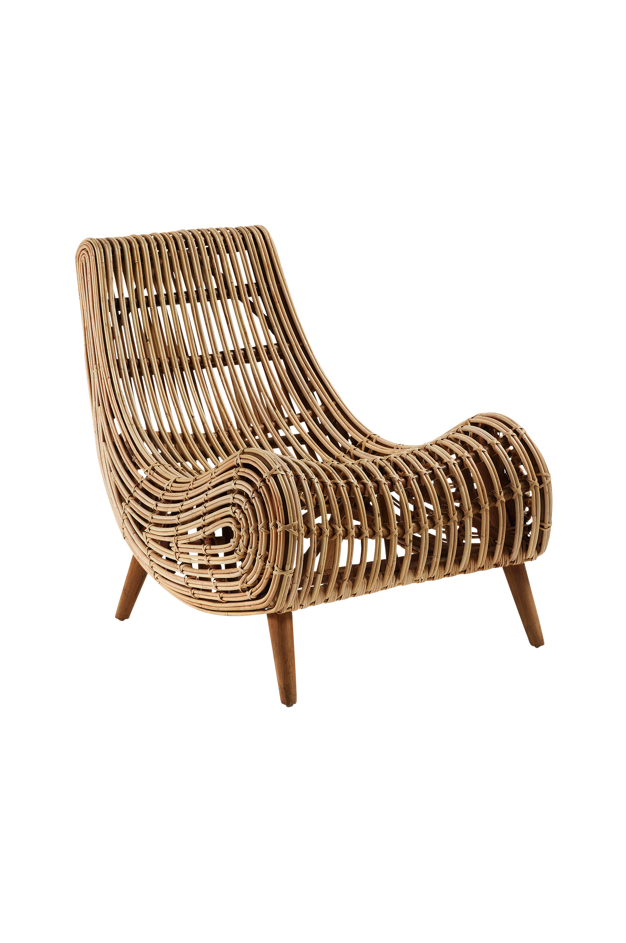Karmstol med stomme av naturfärgad rotting och ben av mahogny. Den stilrena formen gör att stolen passar in i många hem och i olika rum.