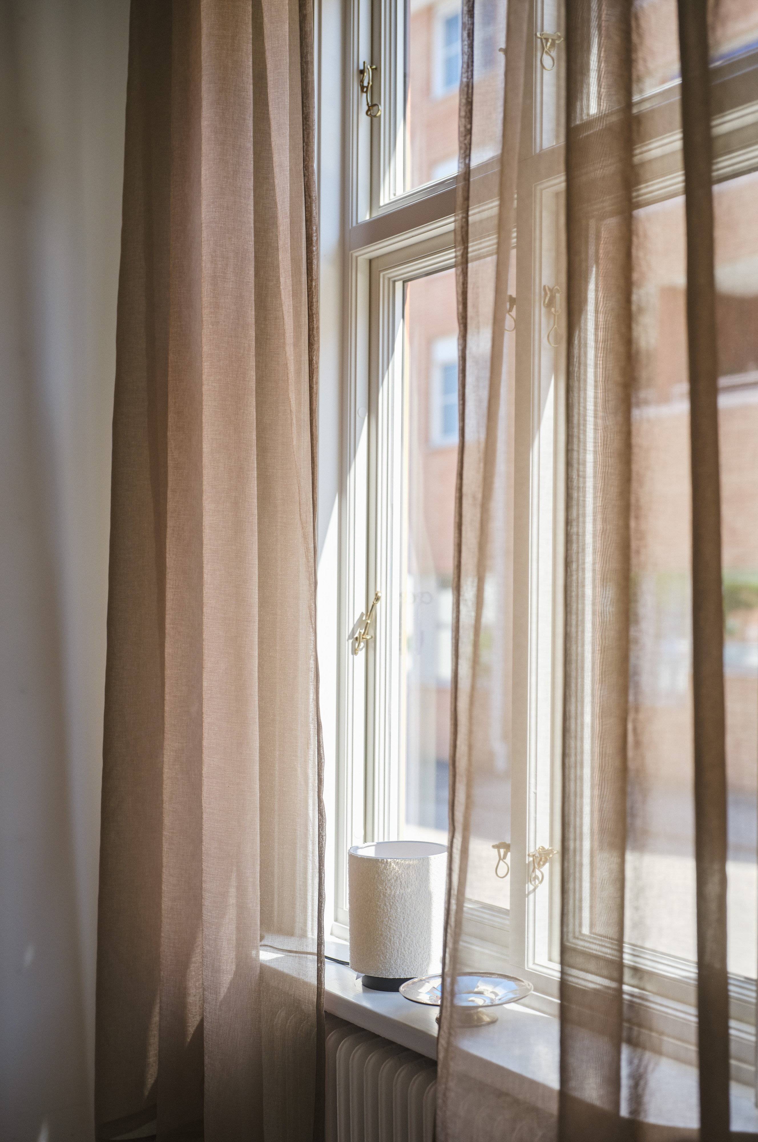 Två gardinlängder i skir och luftig voile polyester som faller lätt och ger mycket ljusinsläpp. Vill du dra för gardinerna för fönstret för att få visst insynsskydd så får du ändå in det härliga ljuset. Hänger de vid sidan om fönstret tar den inte så mycket plats utan upplevs som nättare. Materialet i gardinen är återvunnet.