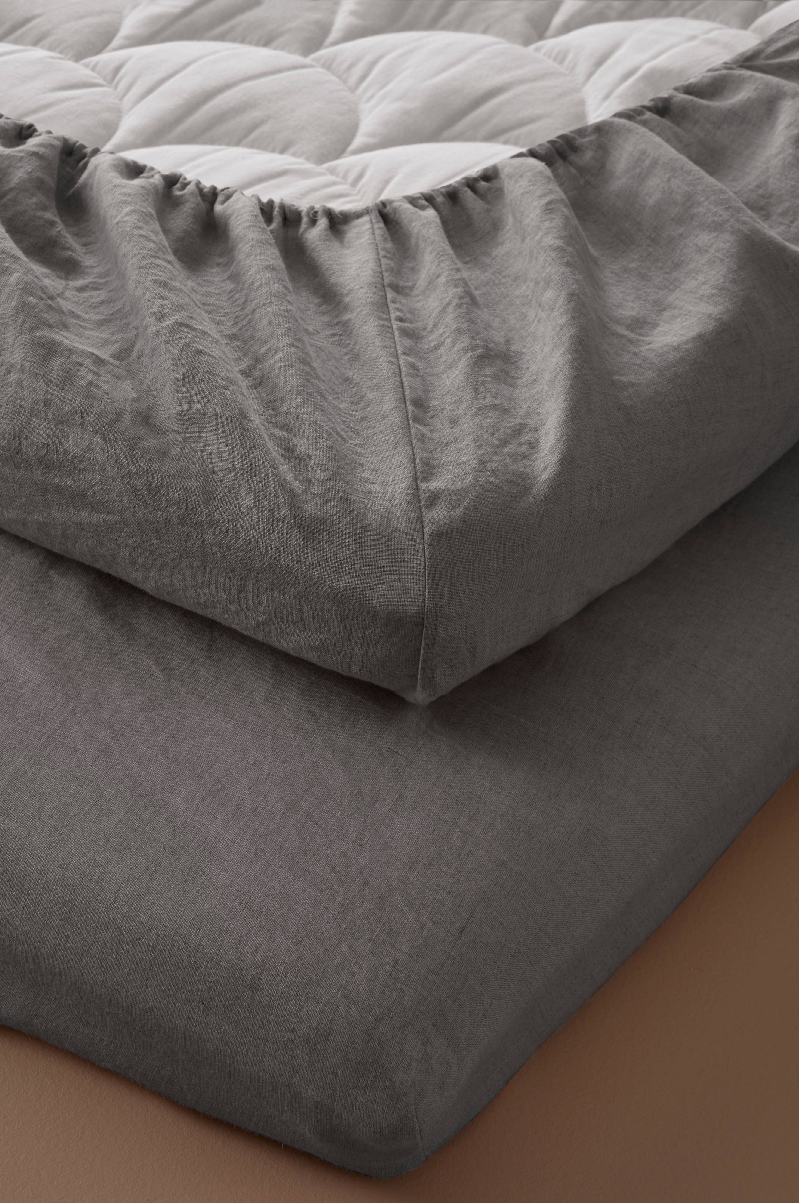Enfärgat dra-på-lakan av plaggtvättat lin. Den elastiska kanten gör att lakanet sitter bra på madrassen. Det är lätt att älska linne, dess egenskaper, känsla och struktur. Linne värmer när det är kallt och är svalt att sova i när det är varmt. Trådtäthet på 110 tc. (Trådtätheten talar om antalet trådar, thread counts, per kvadrattum i ett tyg. Ju högre trådtäthet desto högre kvalité. Med undantag för linne som ofta vävs glesare för att få den rätta känslan.)