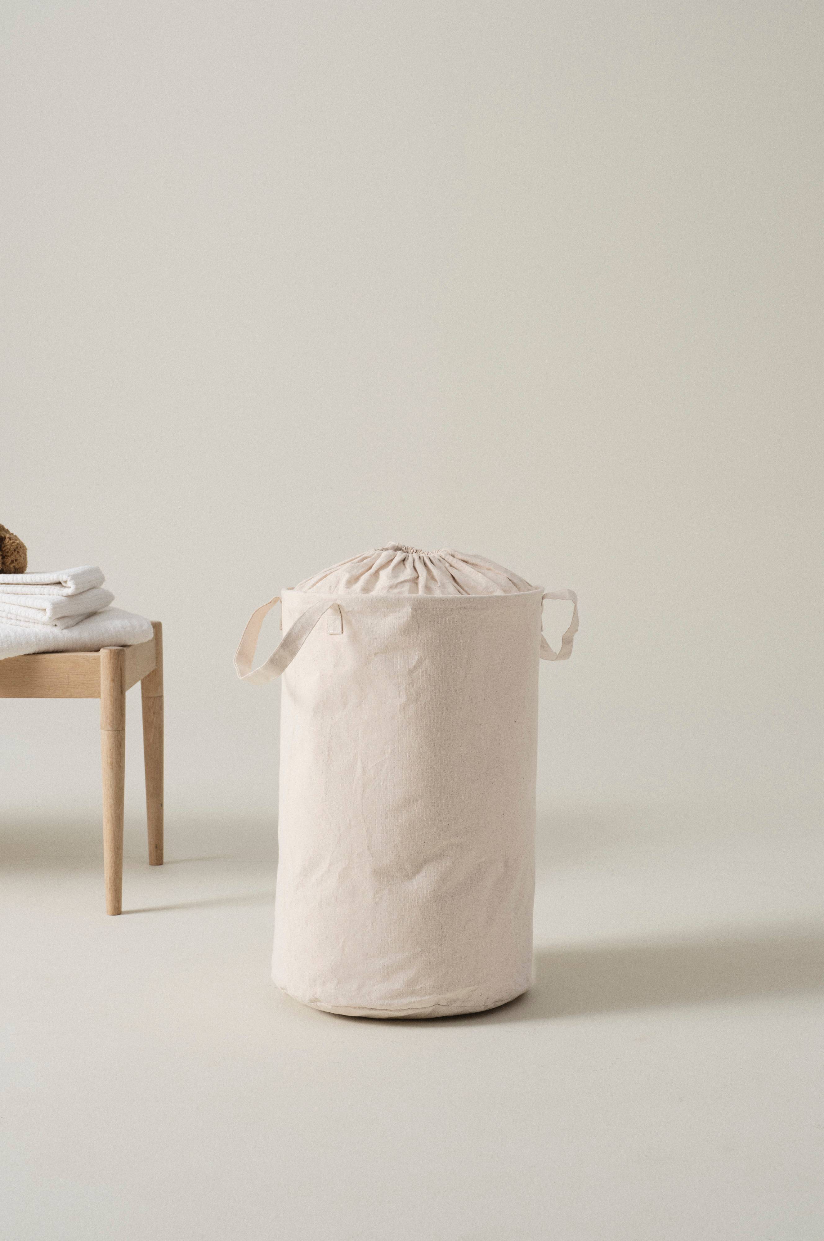 Vävd, enfärgad tvättkorg i bomull och polypropylen. Tvättkorgen har handtag på båda sidor och dragsko för tillslutning. Förvara din tvätt i en prydlig och stilren tvättkorg.