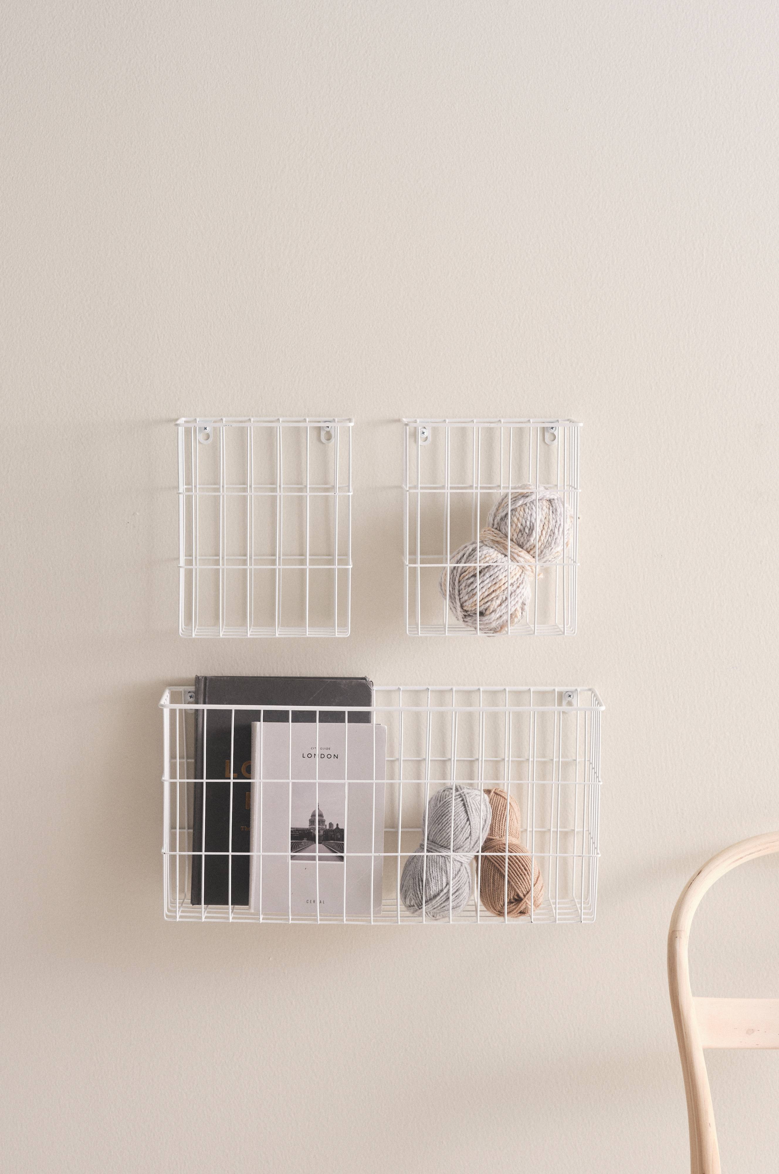 3-pack trådkorgar av järn som är ofärgade eller har matt pulverlackerad yta. Detta är praktisk väggförvaring med fästen så du kan skruva upp dem på väggen eller i ett skåp. Setet innehåller 1 lite större trådkorg och 2 lite mindre, dessa två har samma storlek. Att skapa ordning och reda i tvättstugan, förrådet eller hallen gör livet enklare.