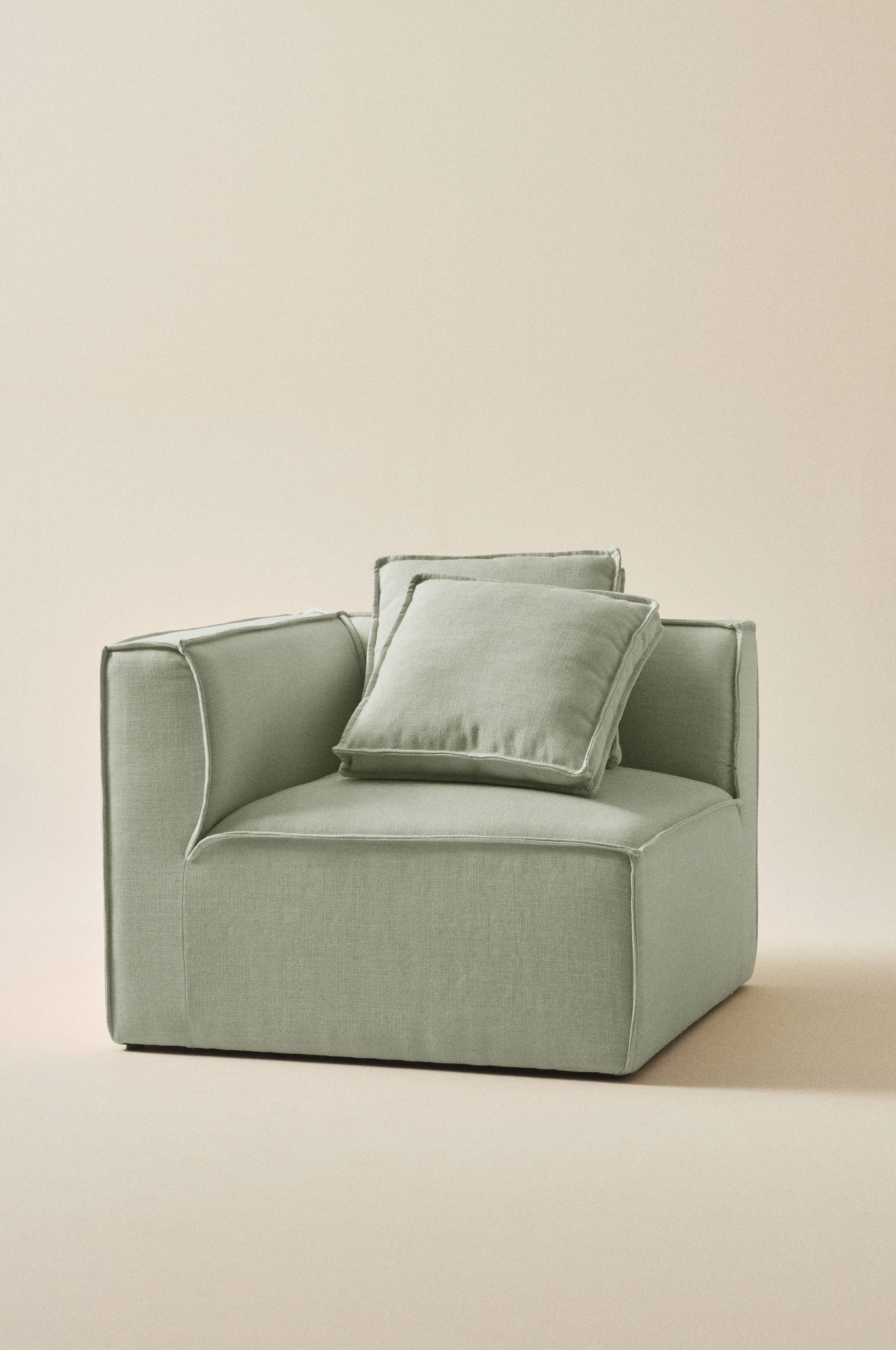 Denna modul passar som fåtölj eller som del i en större möbel som du kombinerar själv. Klädseln är en slitstark linnemix med snygg linnestruktur. Tyget har Martindale på 40000. Två fina kuddar i samma tyg som modulen ingår.