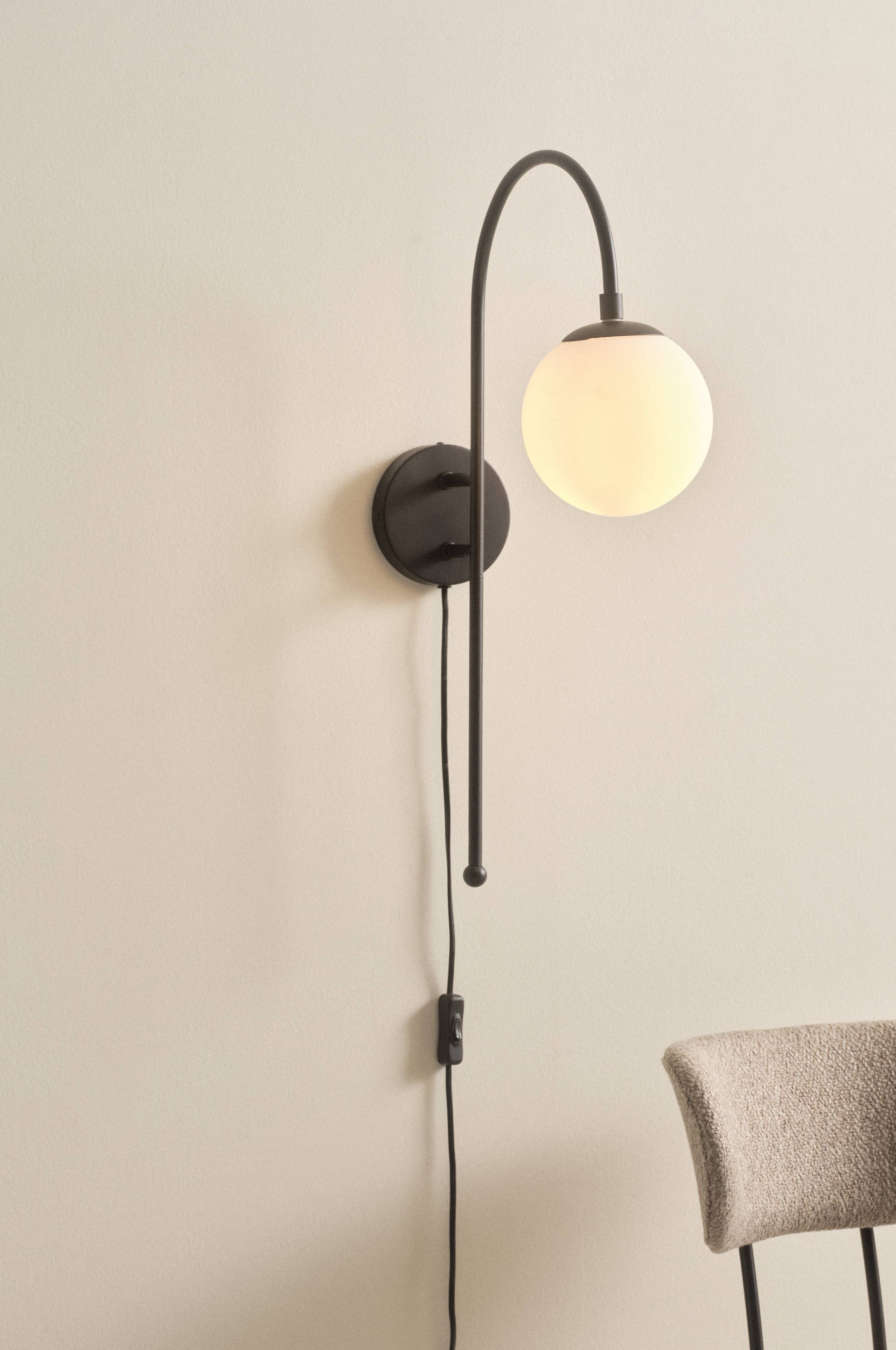 Vägglampan BLANCHE ger ett nätt och piggt intryck med sin vita kupa av opalglas på ett smäckert, snyggt format väggfäste. Svart sladd med strömbrytare på sladden.