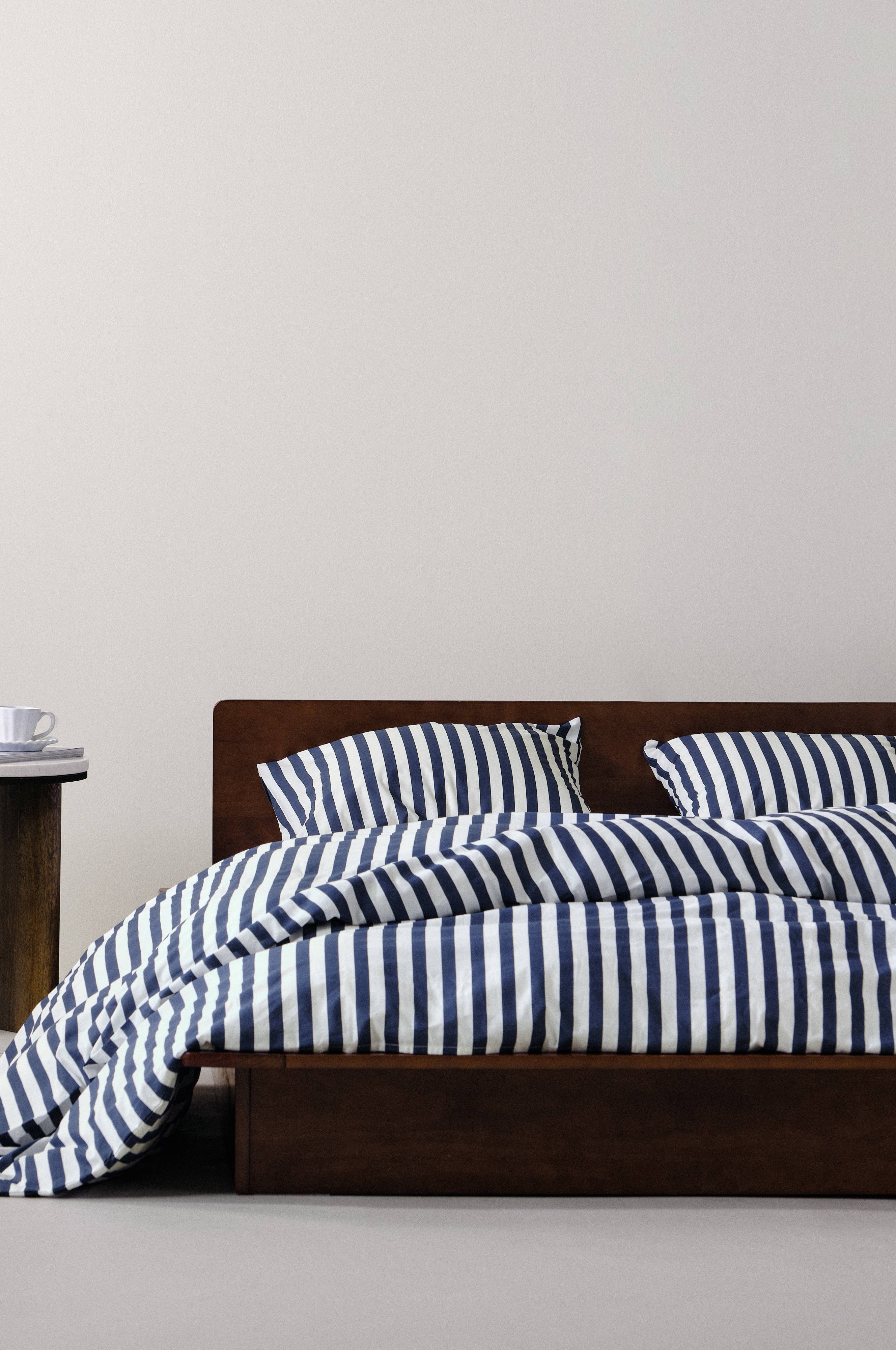 Smalrandigt påslakanset med ett extrabrett påslakan och två örngott i ekologisk bomull. De klassiska ränderna fungerar lika bra till liten som stor. Tyget har ett behagligt tryck, bomull är svalt och skönt mot huden, och känslan att krypa ner i en nybäddad säng är svårslagen. Randmönstret är tryckt i klara, glada färger mixat med varannan rand vit. Öppning i övre hörnen på påslakanet, som underlättar att trä påslakanet över täcket. Trådtäthet på 144 tc. (Trådtätheten talar om antalet trådar, thread counts, per kvadrattum i ett tyg. Ju högre trådtäthet desto högre kvalité.)