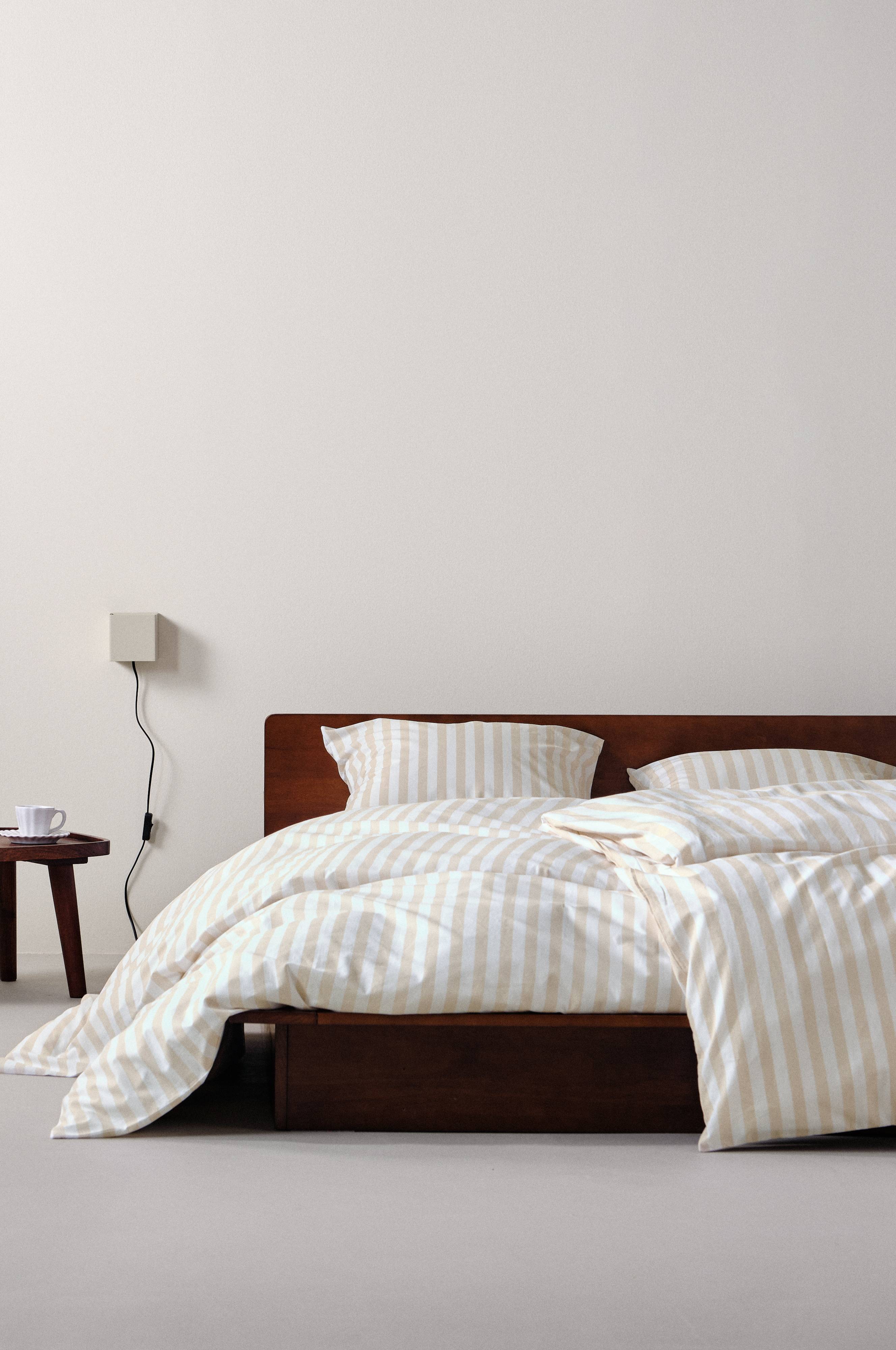 Smalrandigt påslakanset med ett påslakan och ett örngott i ekologisk bomull. De klassiska ränderna fungerar lika bra till liten som stor. Tyget har ett behagligt tryck, bomull är svalt och skönt mot huden, och känslan att krypa ner i en nybäddad säng är svårslagen. Randmönstret är tryckt i klara, glada färger mixat med varannan rand vit. Öppning i övre hörnen på påslakanet, som underlättar att trä påslakanet över täcket. Trådtäthet på 144 tc. (Trådtätheten talar om antalet trådar, thread counts, per kvadrattum i ett tyg. Ju högre trådtäthet desto högre kvalité.)