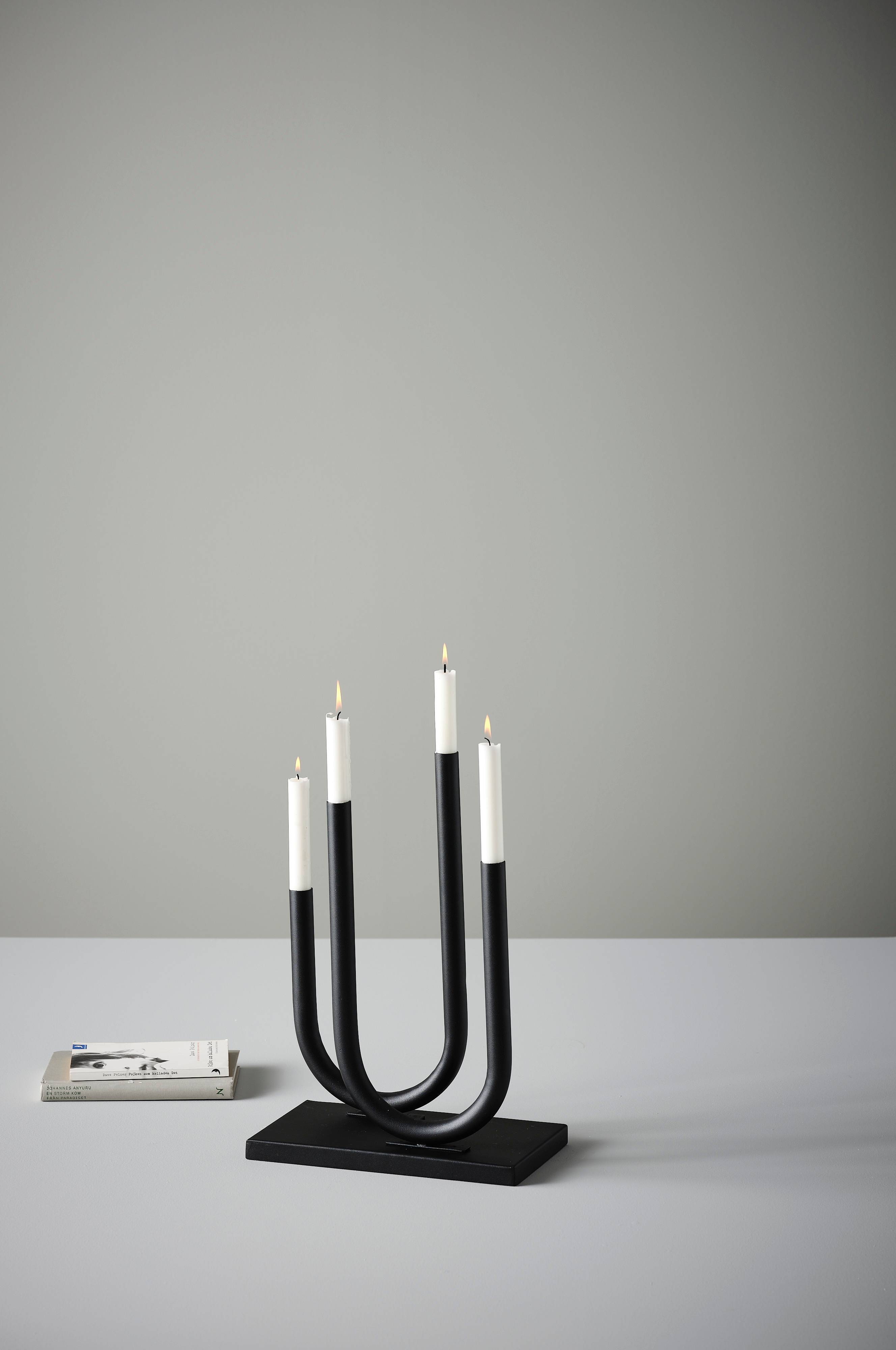 Ljusstake av metall med fyra ljushållare. Bowie är pampig och med rena linjer smälter den in i många olika stilar. Den tidlösa modellen har två u-formade rör med ljushållare i olika höjd. Plattan har textilklädd botten för att stå mjukt och stadigt.