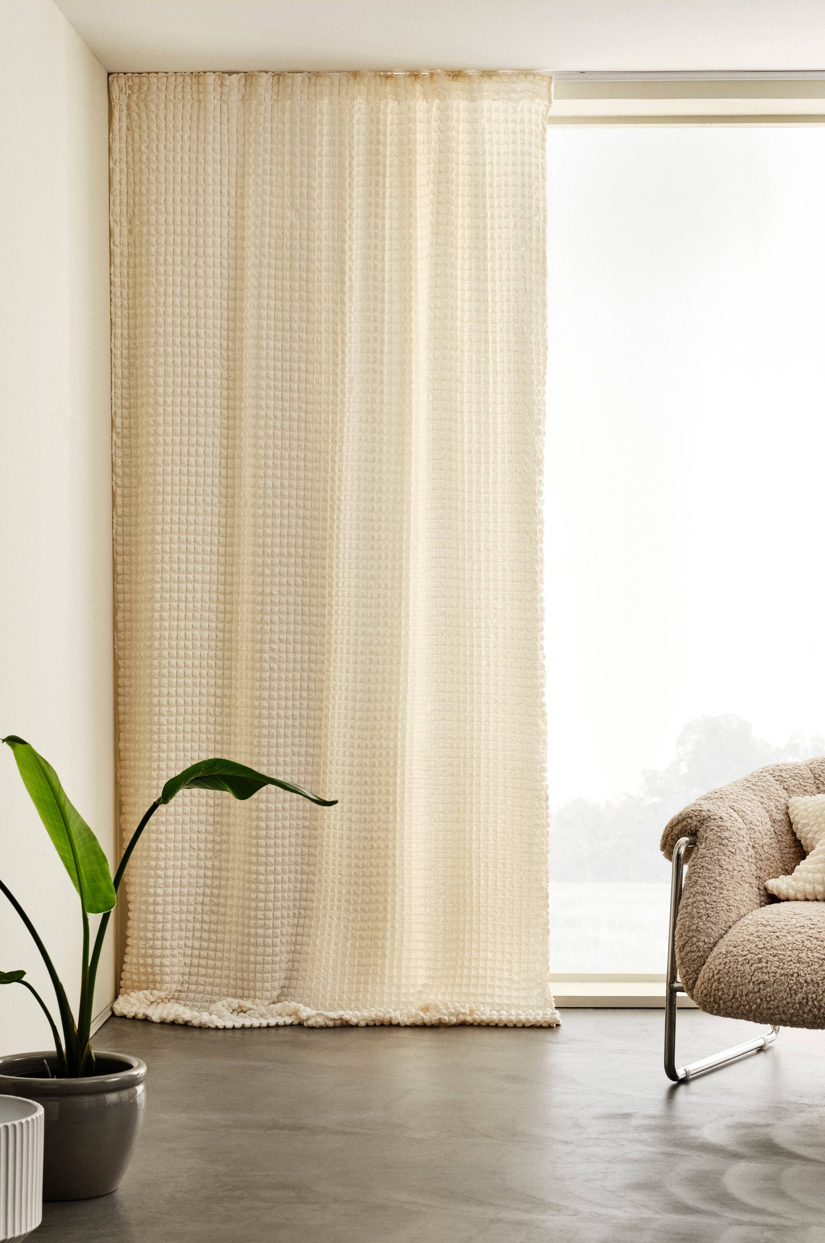 En gardinlängd i ett bubbligt, uppseendeväckande tyg av polyester med inblandning av spandex. Kvalitén i kombination med vävtekniken ger tyget sin läckra effekt, det har mjuka bubblor och det är dessutom elastiskt. Overlocksöm i nederkant. Längden har påsytt multifunktionsband och kan hängas upp med fingerkrokar, kanal samt dold hälla.