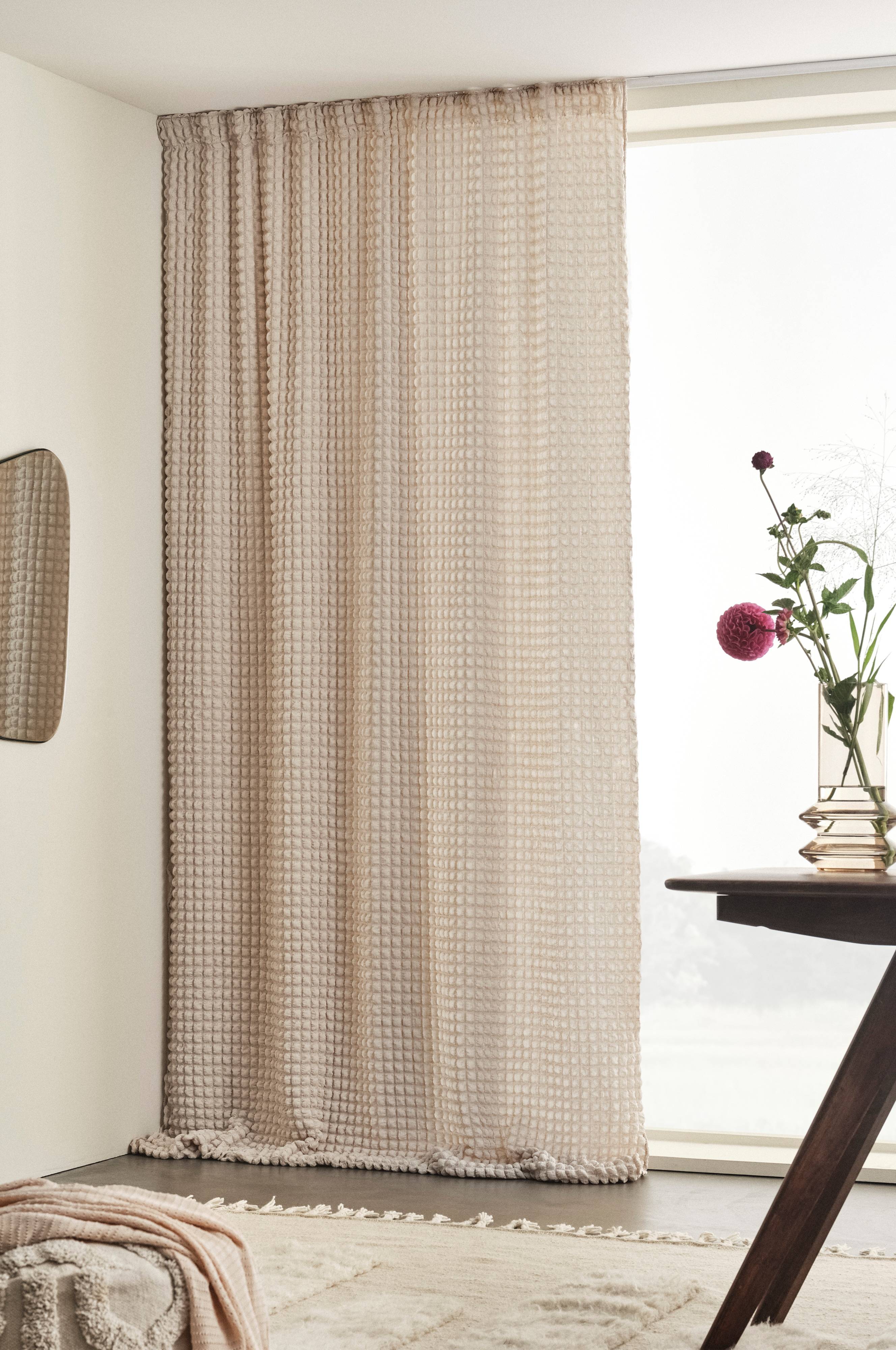 En gardinlängd i ett bubbligt, uppseendeväckande tyg av polyester med inblandning av spandex. Kvalitén i kombination med vävtekniken ger tyget sin läckra effekt, det har mjuka bubblor och det är dessutom elastiskt. Overlocksöm i nederkant. Längden har påsytt multifunktionsband och kan hängas upp med fingerkrokar, kanal samt dold hälla.