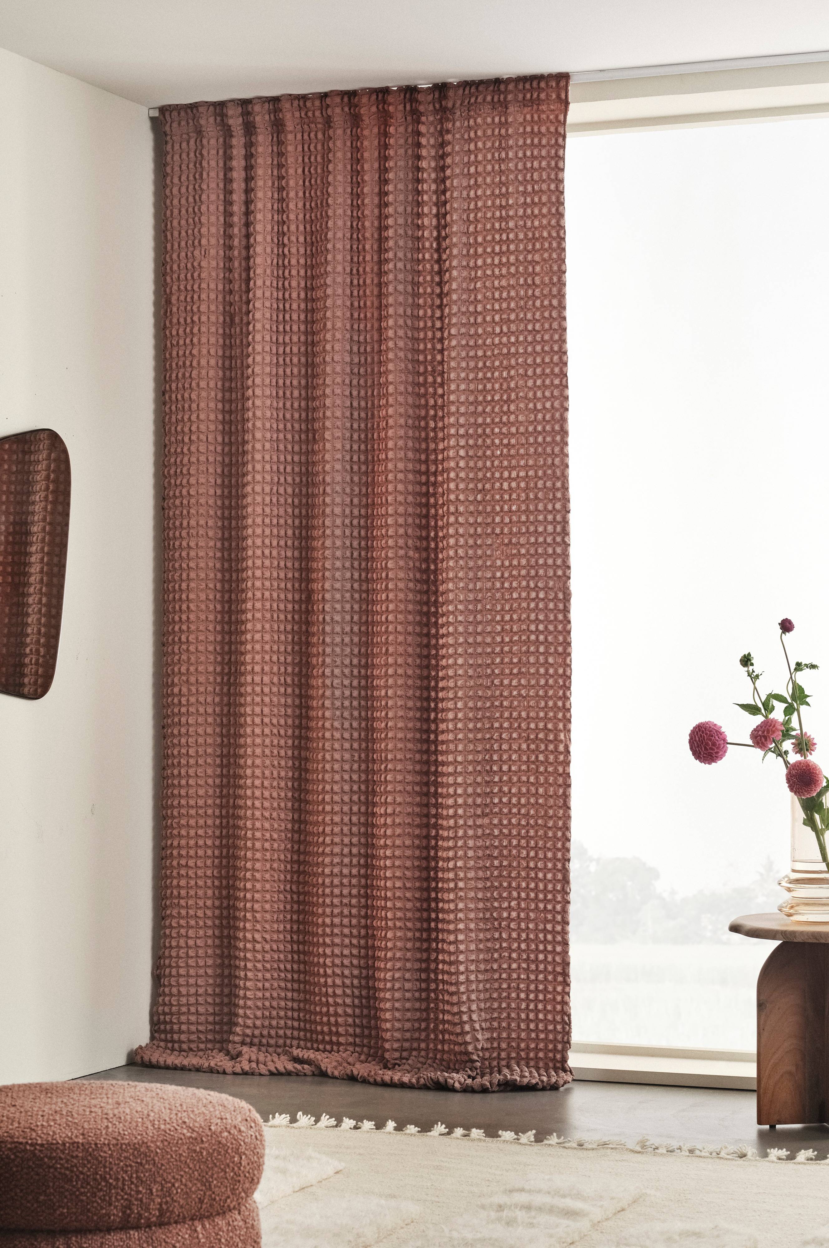 En gardinlängd i ett bubbligt, uppseendeväckande tyg av polyester med inblandning av spandex. Kvalitén i kombination med vävtekniken ger tyget sin läckra effekt, det har mjuka bubblor och det är dessutom elastiskt. Overlocksöm i nederkant. Längden har påsytt multifunktionsband och kan hängas upp med fingerkrokar, kanal samt dold hälla.