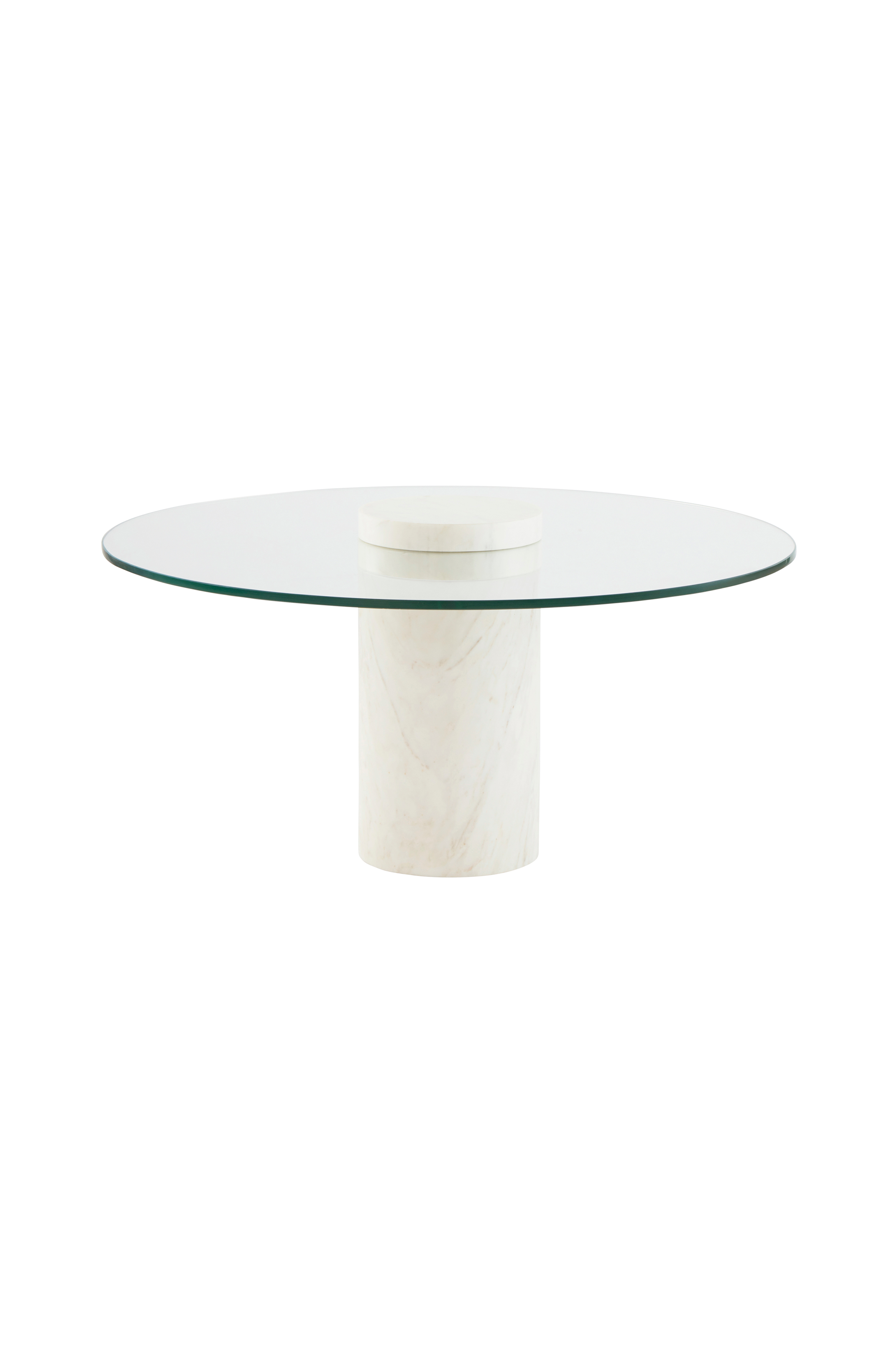 Runt soffbord med bordsskiva av klarglas och bordsben av marmor. Bordsskivan av glas får en svävande känsla med det kraftiga bordsbenet av marmor i mitten. CALVIN är ett stilrent bord som ger en morden och sofistikerad känsla till ditt rum. Marmor är en natursten och mönstret varierar alltid lite beroende på bergartens sammansättning, vilket gör varje möbel unik. Viss montering krävs.
