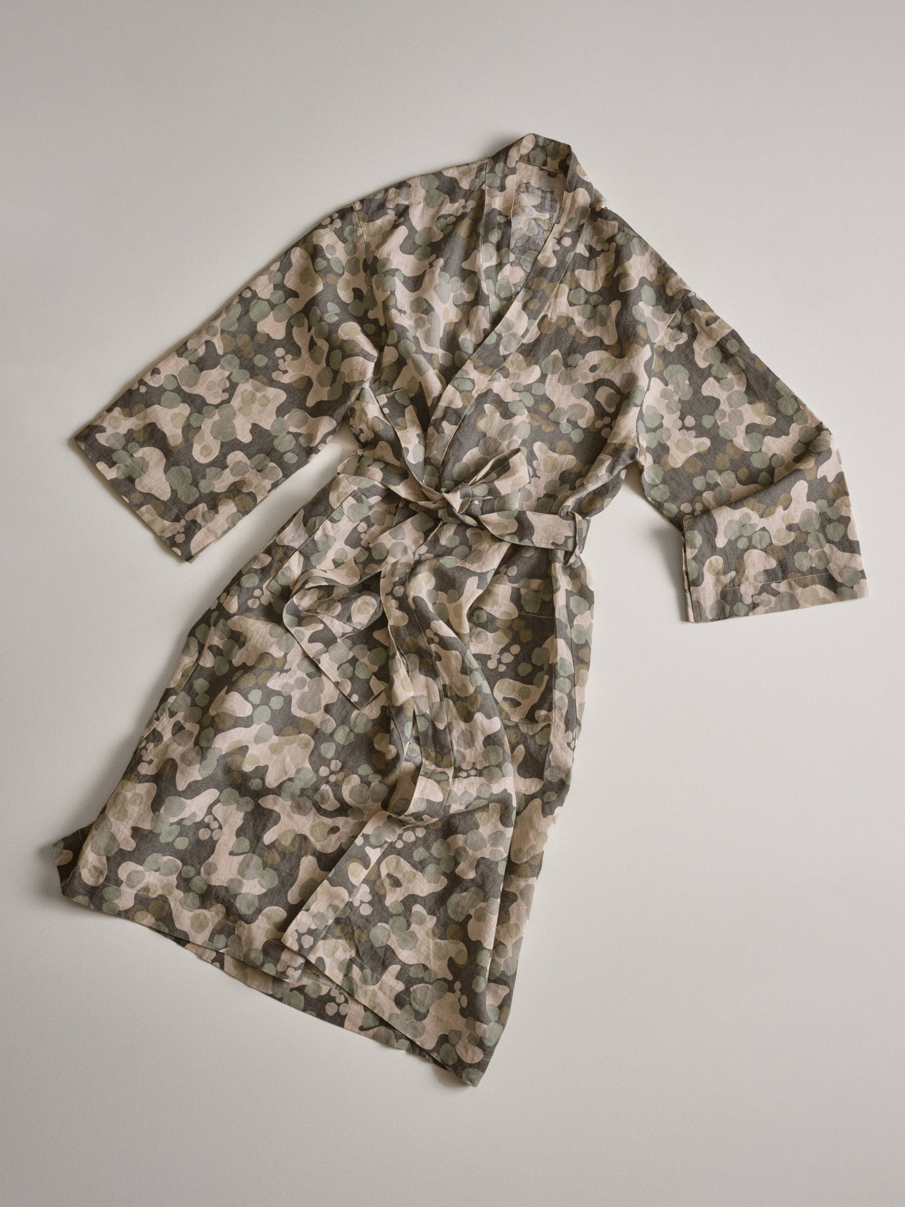 Kimono i lång modell av naturligt och behagligt linne med tryckt mönster som designats av Maria Carlberg. Den sköna linnekvalitén har tvättats för att bli härligt mjuk och skön. Mysig modell knytskärp i midjan och två framfickor.