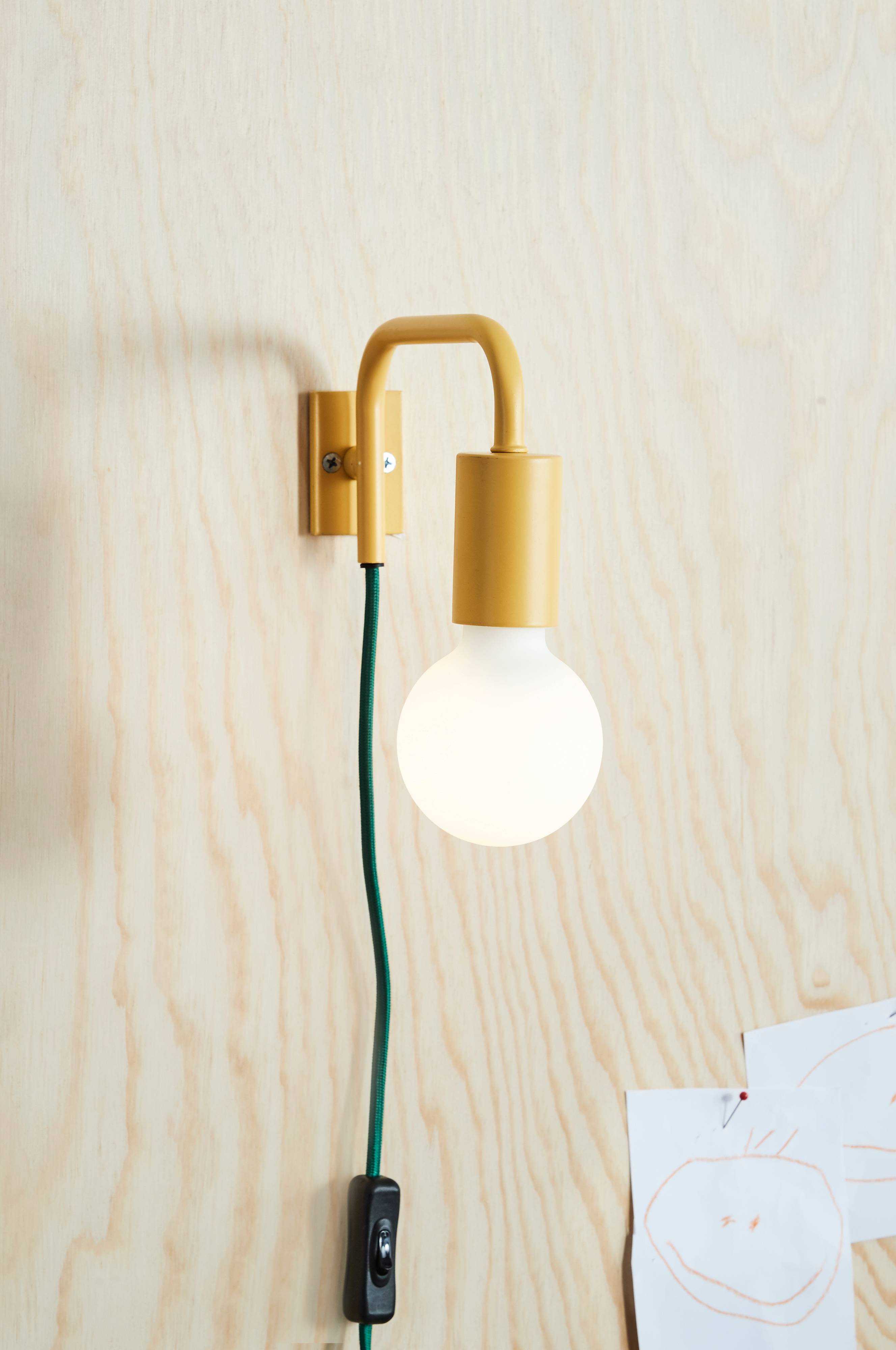 Vägglampa i metall i glada färger. Lampan är fin på väggen ovanför skrivbordet eller ovanför sänggaveln och du kan variera den med valet av glödlampa. Textilsladd 1,8 m.