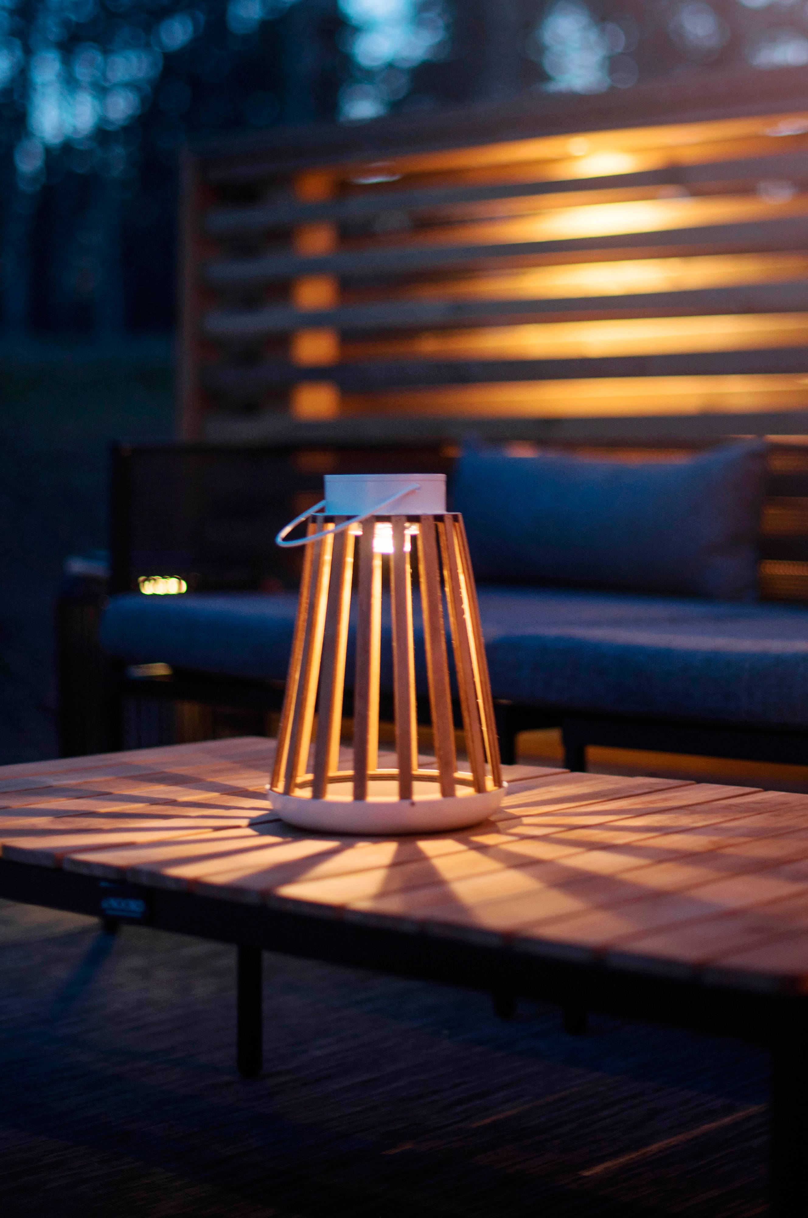 Lykta med metallbotten och metalltopp, där emellan fina träribbor som släpper ut ett varmvitt sken genom springorna. Lyktan har LED-belysning som drivs av solenergi. Den laddas upp under dagen och lyser sedan upp din sommarkväll. Lyktan är för utomhusbruk. Livslängd ca 5000 timmar.