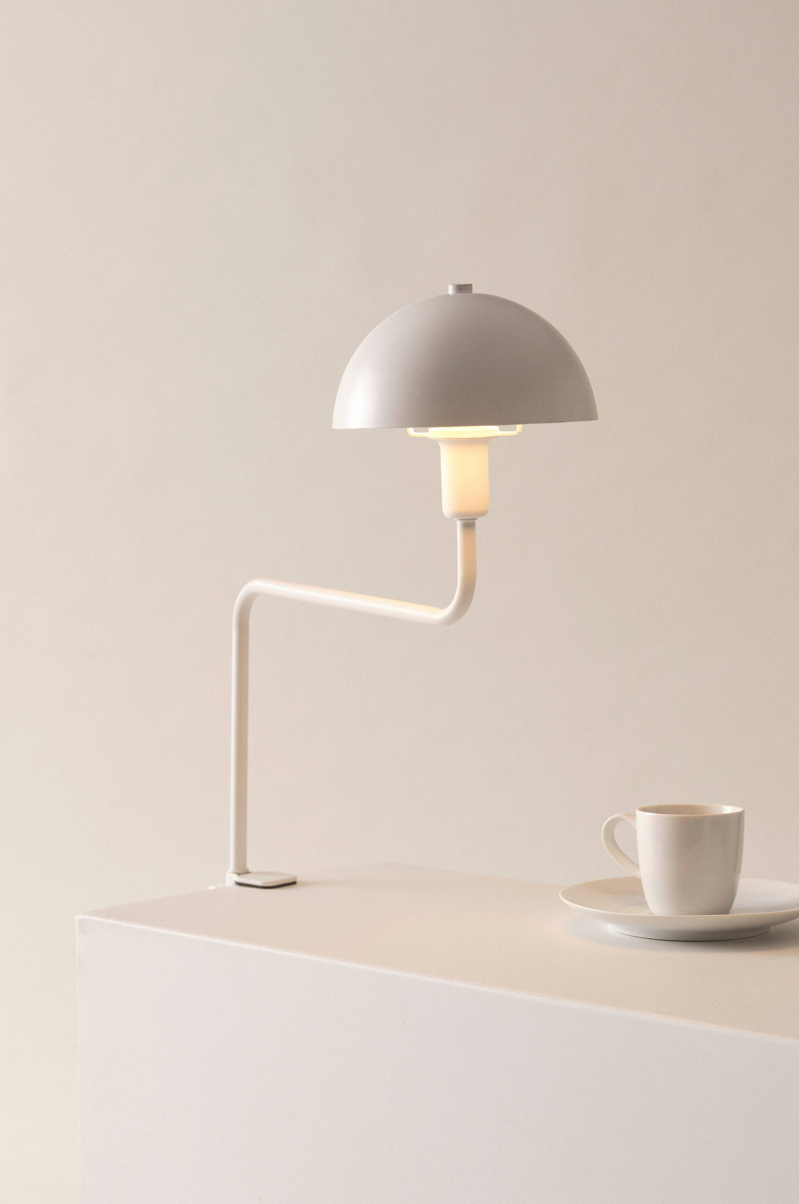 Bordslampa i mattsvart järn. Bordslampan är nätt och diskret, med fint formad metallkupa som fokuserar ljuset nedåt utan att blända. Lampan skruvas fast i bordsskivan vilket är praktiskt vid ditt skrivbord, då stjäl lampan inget utrymme från arbetsytan. Skruvtvingen som fäster lampan är helt i metall och plastsladden matchar lampans färg. Strömbrytaren sitter på sladden. Lampan är ojordad klass 2.