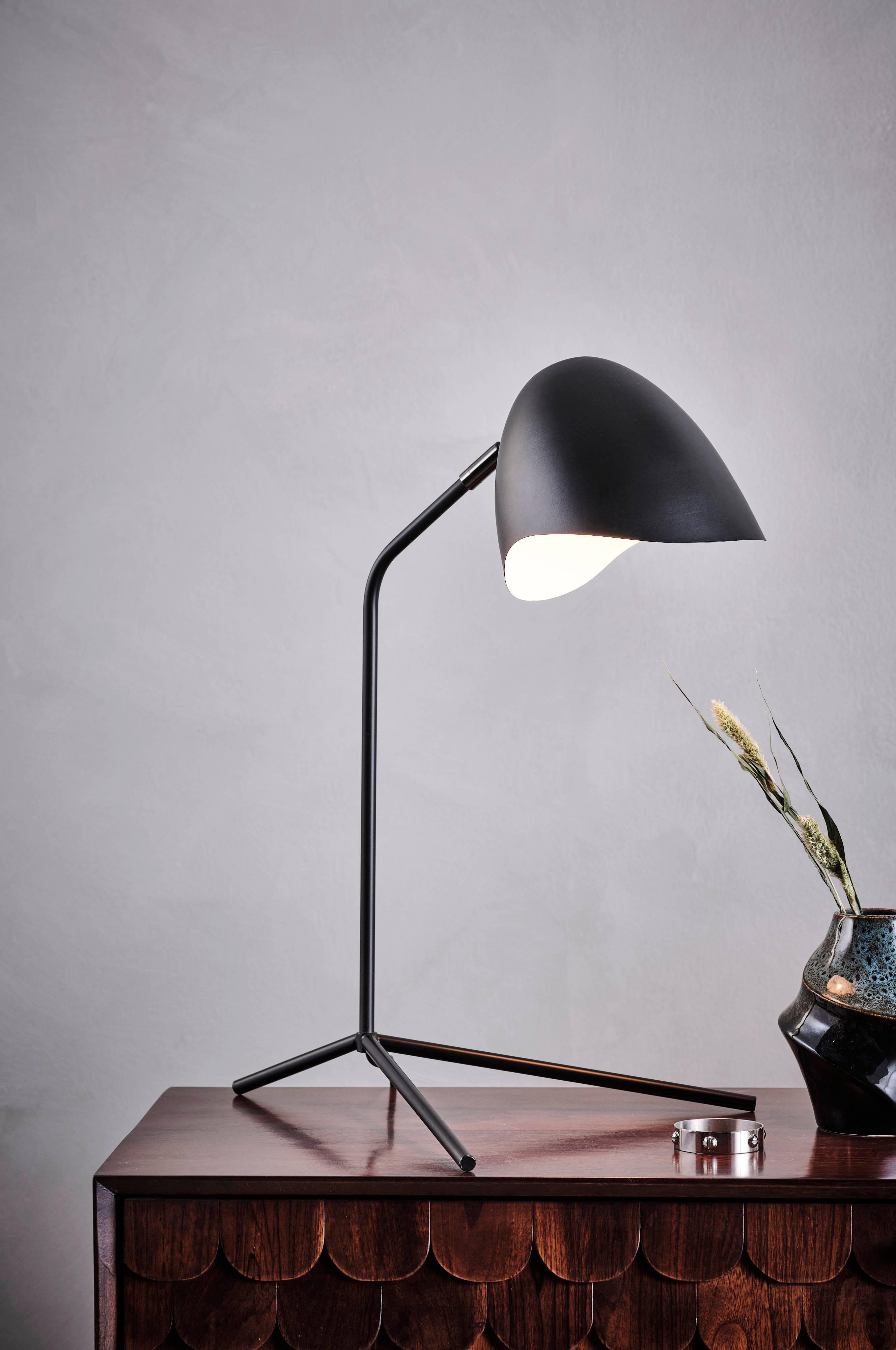 Bordslampa i mattsvart metall, skärmen har mattsvart utsida och blank, vit insida som reflekterar ljuset fint. Den asymmetriska skärmen är riktbar. Svart sladd, sladdlängd 1,5 m.