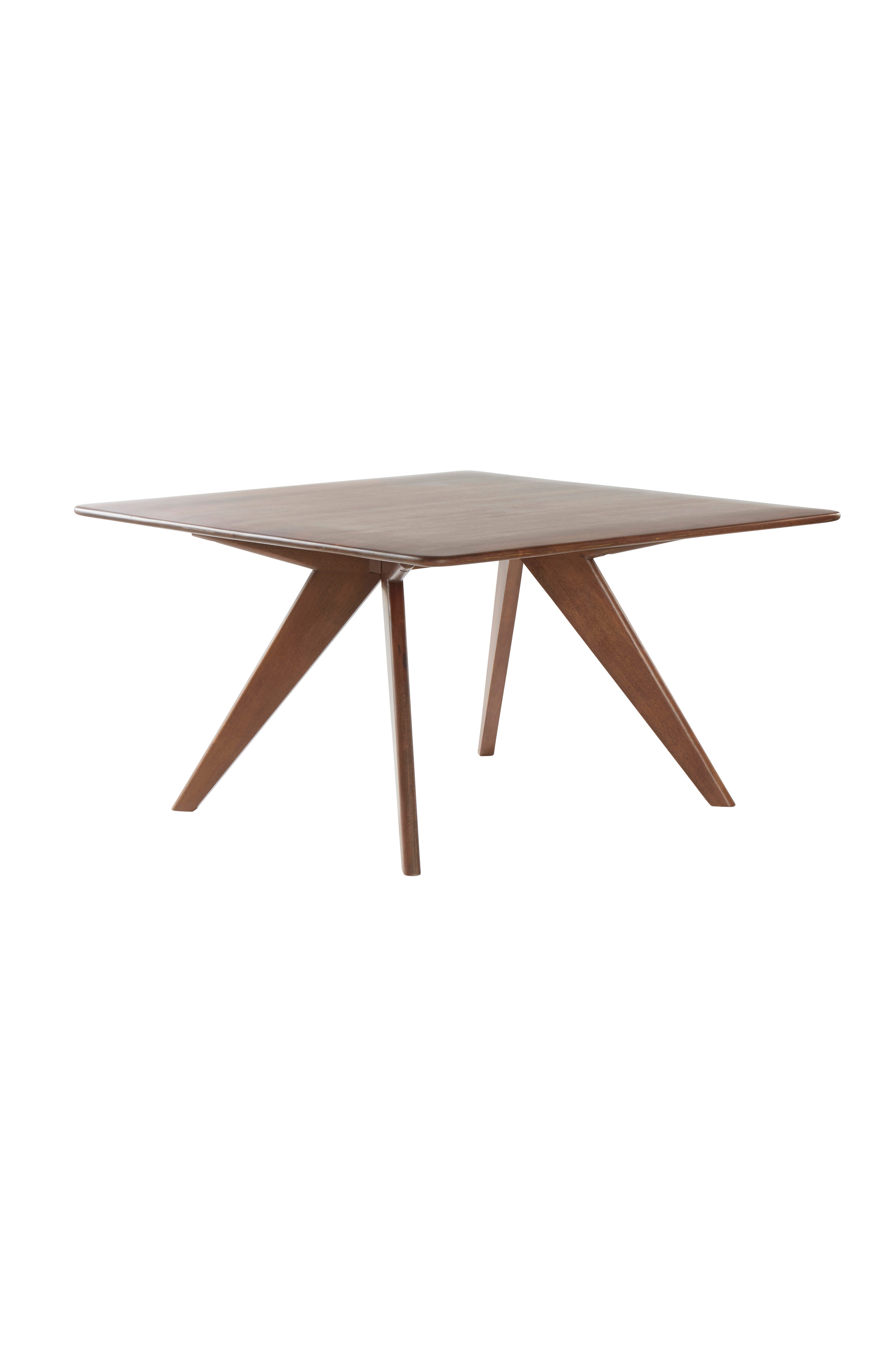 Kvadratiskt matbord i massivt mangoträ. Den släta bordsskivan har rundade hörn och lätt välvd ytterkant runtom, som för tanken till 60-talet. De snyggt formade benen förstärker retrokänslan och den praktiska placeringen av benen ger bättre sittplats runt bordet.
