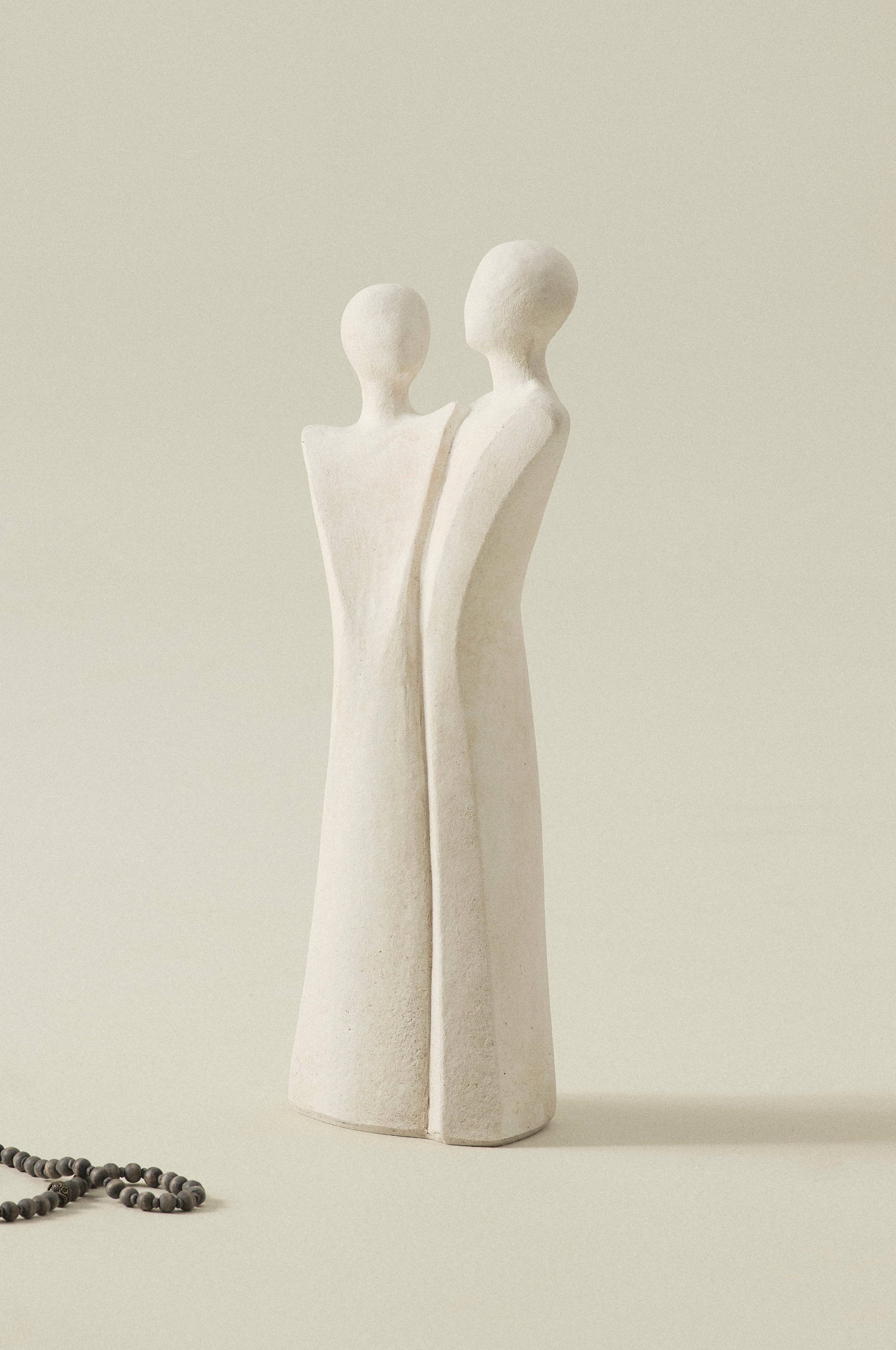 Handgjord skulptur av polyresin. Det vackra paret är stilrent skulpterat och materialet har en känsla av sandsten. De rena linjerna och den mjuka, ljusa färgen ger ett harmoniskt och vänligt intryck. Det fina hantverket gör varje skulptur unik.