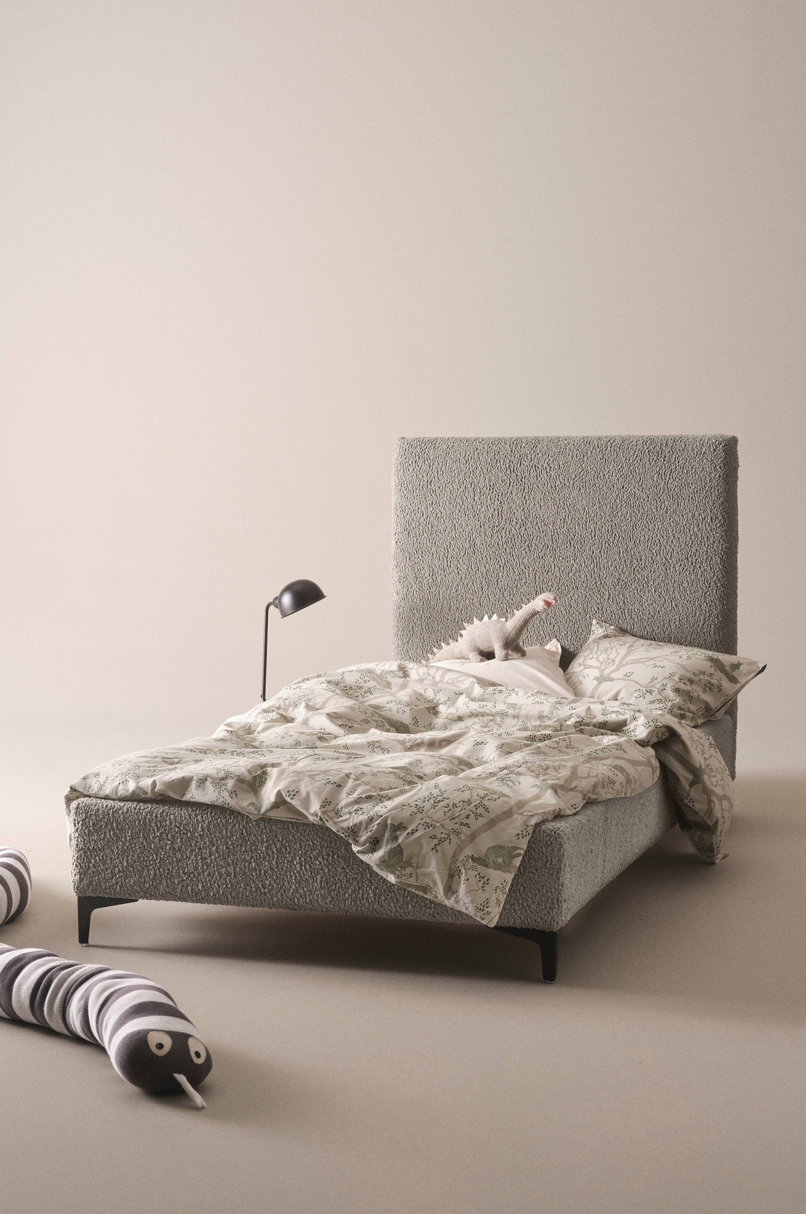 Barnsäng med klädsel i mjuk teddy. Det tåliga teddytyget har slitstyrka på 100000 Martindale. Stommen är av massivt trä och plywood och mjuk skumfyllning. En mjuk och mysig säng som passar perfekt när ditt barn har vuxit ur juniorsängen. Sängen har ribbotten och kompletteras med madrass i storleken 90x200 cm. Madrass medföljer ej.