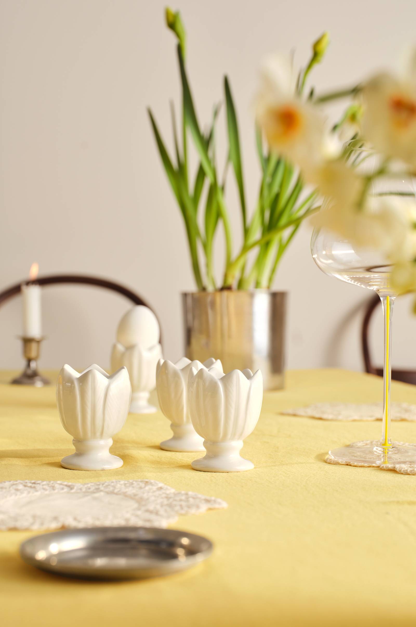 Dagny äggkopp är ett charmigt sätt att servera morgonens ägg med stil. Med sin klassiska tulpanform ger denna uppsättning om fyra en touch av elegans till ditt matbord och gör att frukosten känns speciell varje dag. Perfekt för daglig användning.