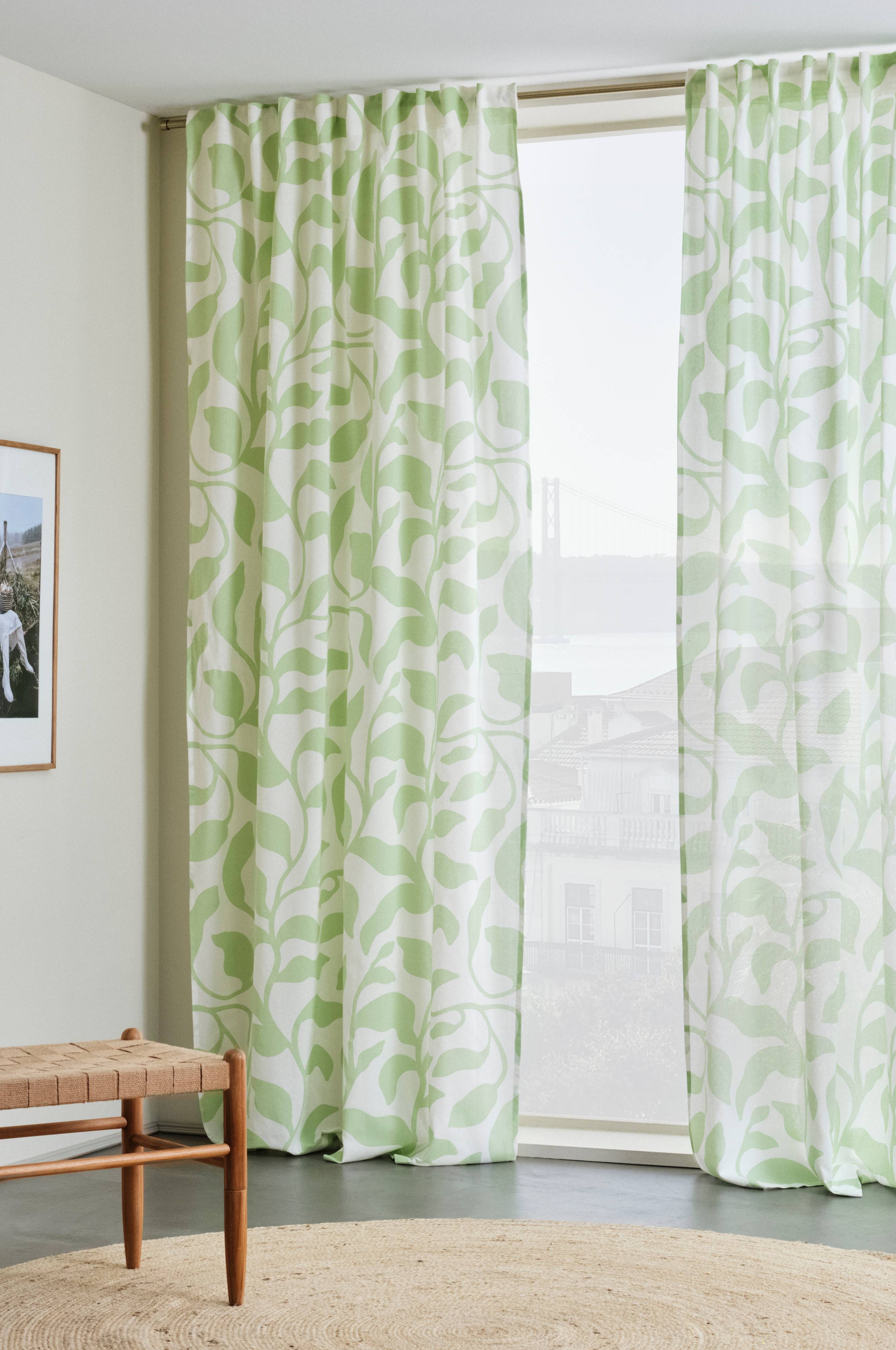 Två gardinlängder i halvpanama av bomull. Delarna i programmet DELLA har charmigt bladmönster i somrig färg tryckt på vit botten. DELLA har påsytt multifunktionsband och gardinen kan hängas upp med fingerkrokar, kanal samt dold hälla. Tygets gramvikt 170 g/m².