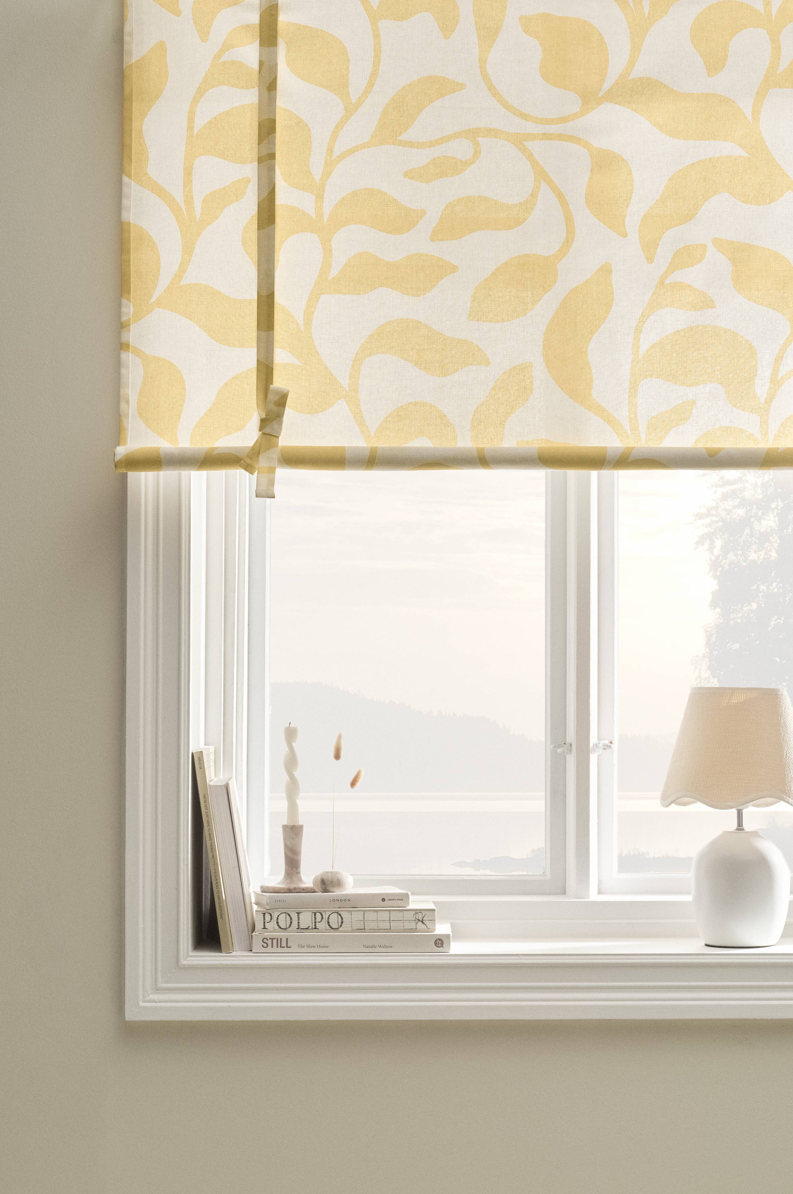 Roll up-gardin i halvpanama av bomull. Delarna i programmet DELLA har charmigt bladmönster i somrig färg tryckt på vit botten. Roll up-gardinen hängs på vanlig gardinstång. Höjden regleras med knytband. Tygets gramvikt 170 g/m².