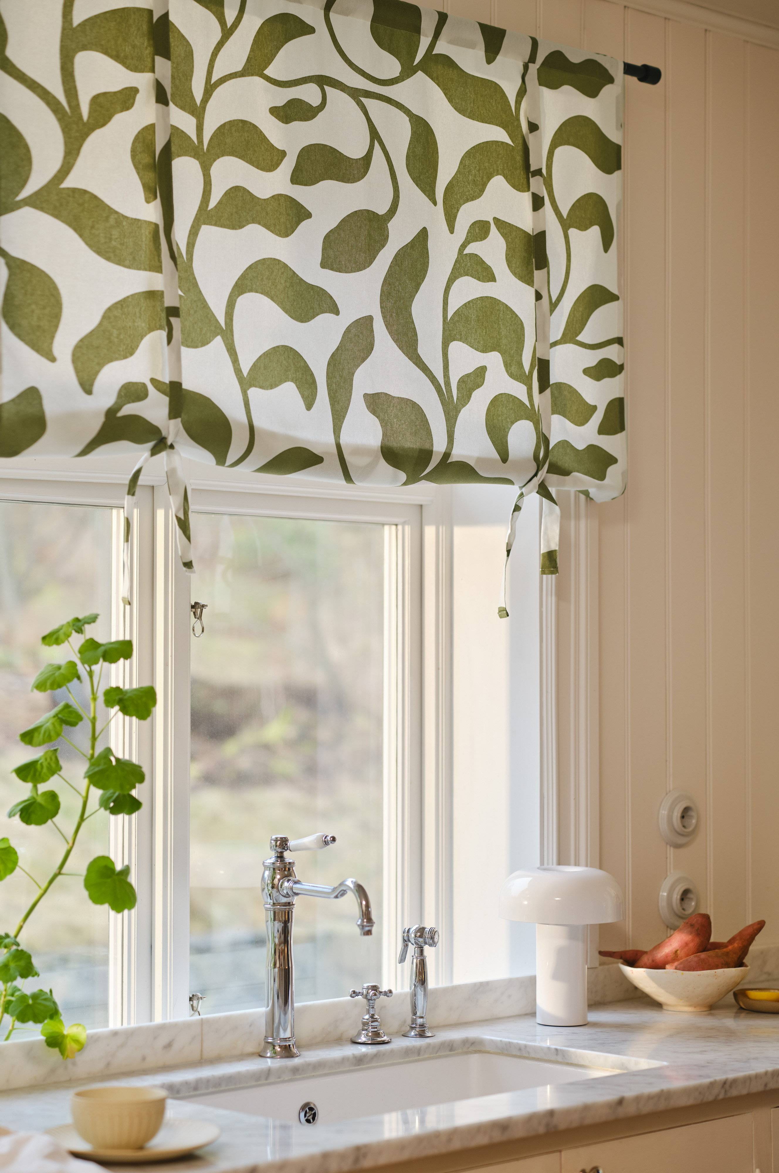 Roll up-gardin i halvpanama av bomull. Delarna i programmet DELLA har charmigt bladmönster i somrig färg tryckt på vit botten. Roll up-gardinen hängs på vanlig gardinstång. Höjden regleras med knytband. Tygets gramvikt 170 g/m².