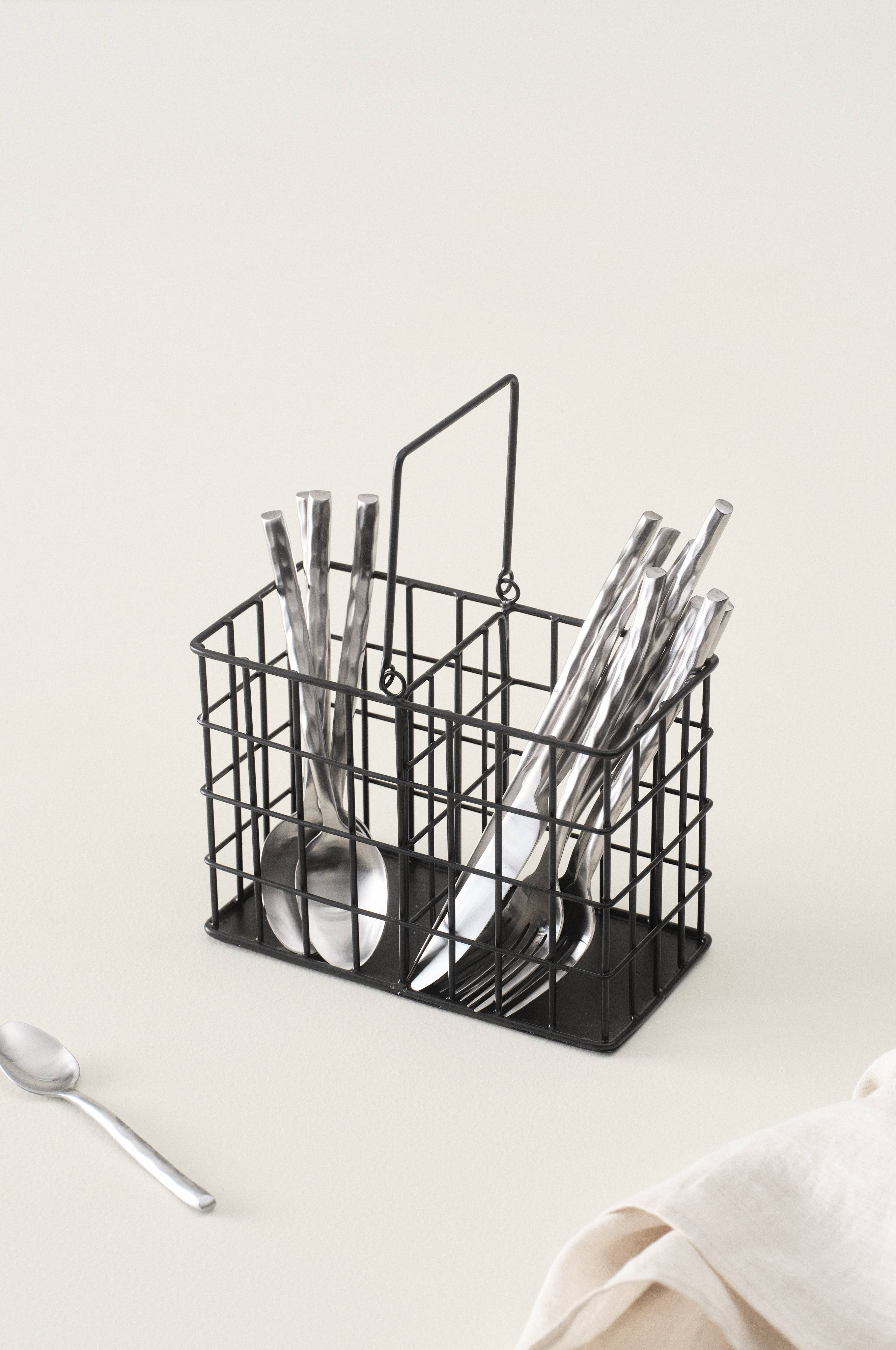 Bestickkorg av järn i matt färg. Trådkorgen har ett handtag mitt på korgen, som faller ner när du inte bär i det. Bestickkorgen är användbar till mycket, och förutom att ha bestick i den på buffébordet kan du servera brödpinnar i den. Den fungerar förstås till förvaring i lådor och skåp också. I barnkammaren blir det enkelt att hitta rätt saker i bokhyllan när barnet ser vad som ryms i korgen.
