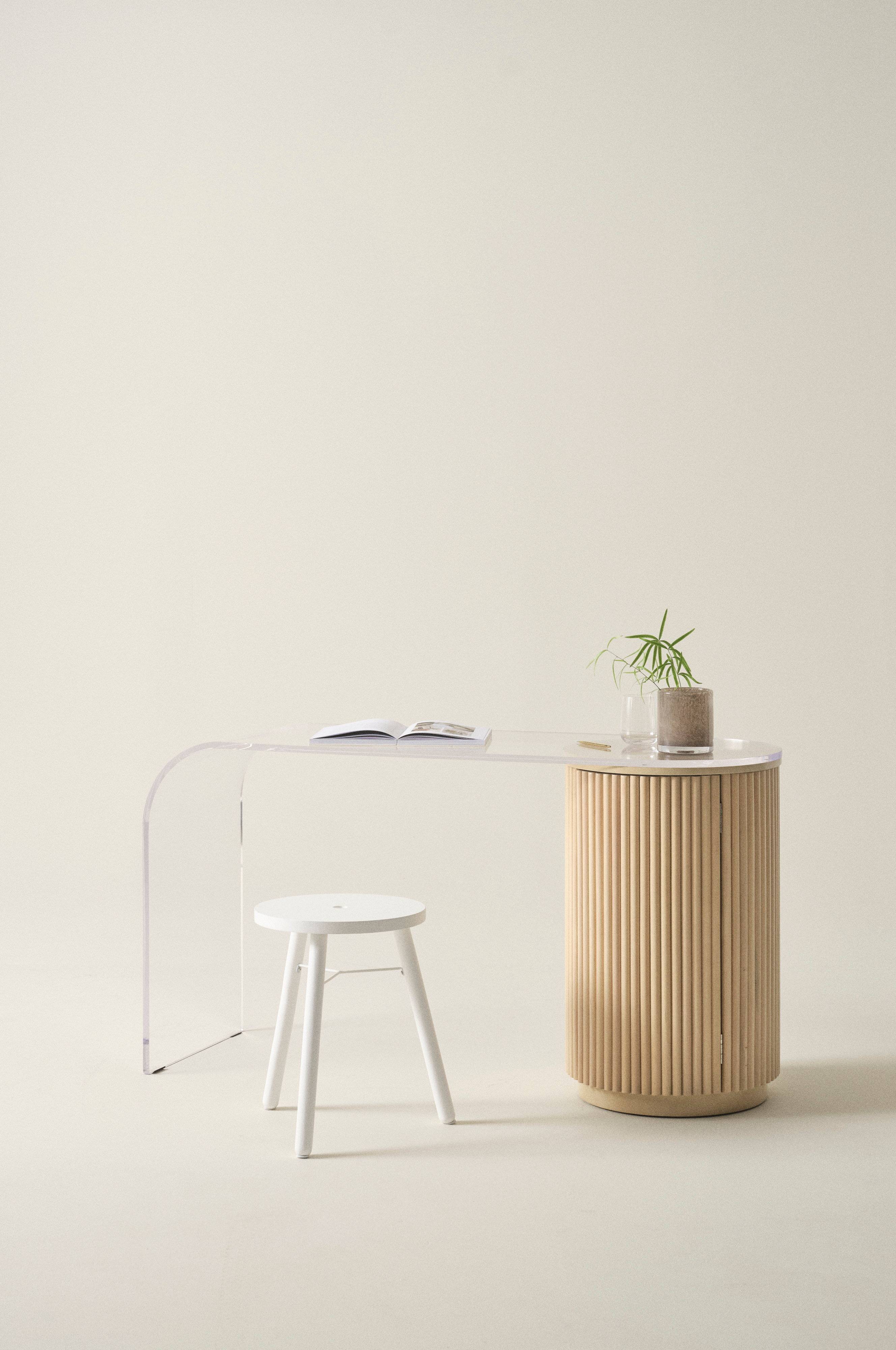 Skrivbord som är mycket välarbetat och gediget, tillverkat av akrylglas, MDF och massiv furu med mjuk, vitsåpad yta med lackfinish. Skrivbordet DEXX är unikt och mycket elegant. Det ger dig ett riktigt snyggt hemmakontor och kommer att bli en dekorativ del av ditt hem, även i vardagsrummet om du vill placera det där. Bordsskivan i akrylglas övergår i benet på vänster sida, allt är i ett stycke och det ger skrivbordet ett nätt och luftigt intryck. Benet till höger är ett runt skåp med dold dörr. Skåpet är klätt med halva rundstavar som ger hela skrivbordet sin vackra och spännande karaktär. Invändigt har skåpet en fast hylla och dörren har pushfunktion och magnetlås. DEXX är ett skrivbord utöver det vanliga, med gedigen känsla och fina detaljer.