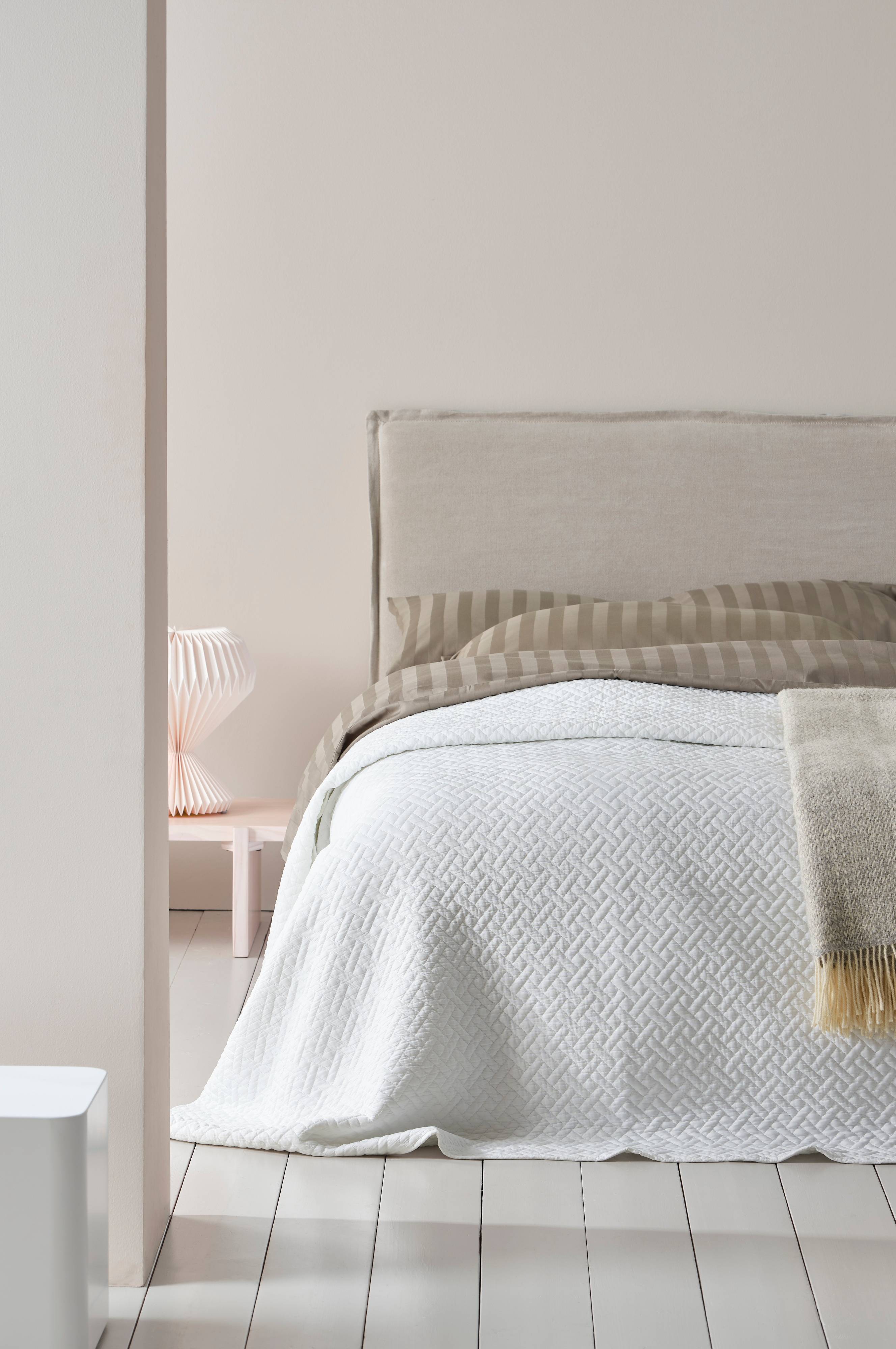 Överkast för dubbelsäng. Överkastet har finquiltat mönster med små diagonala rutor och en liten sydd kant runt om. Det quiltade mönstret har en smidig vaddering, 120 g. DINNY är ett fräscht överkast som smälter in fint och det är behagligt och enkelt att bädda med. Kuddfodral medföljer ej, köps separat.