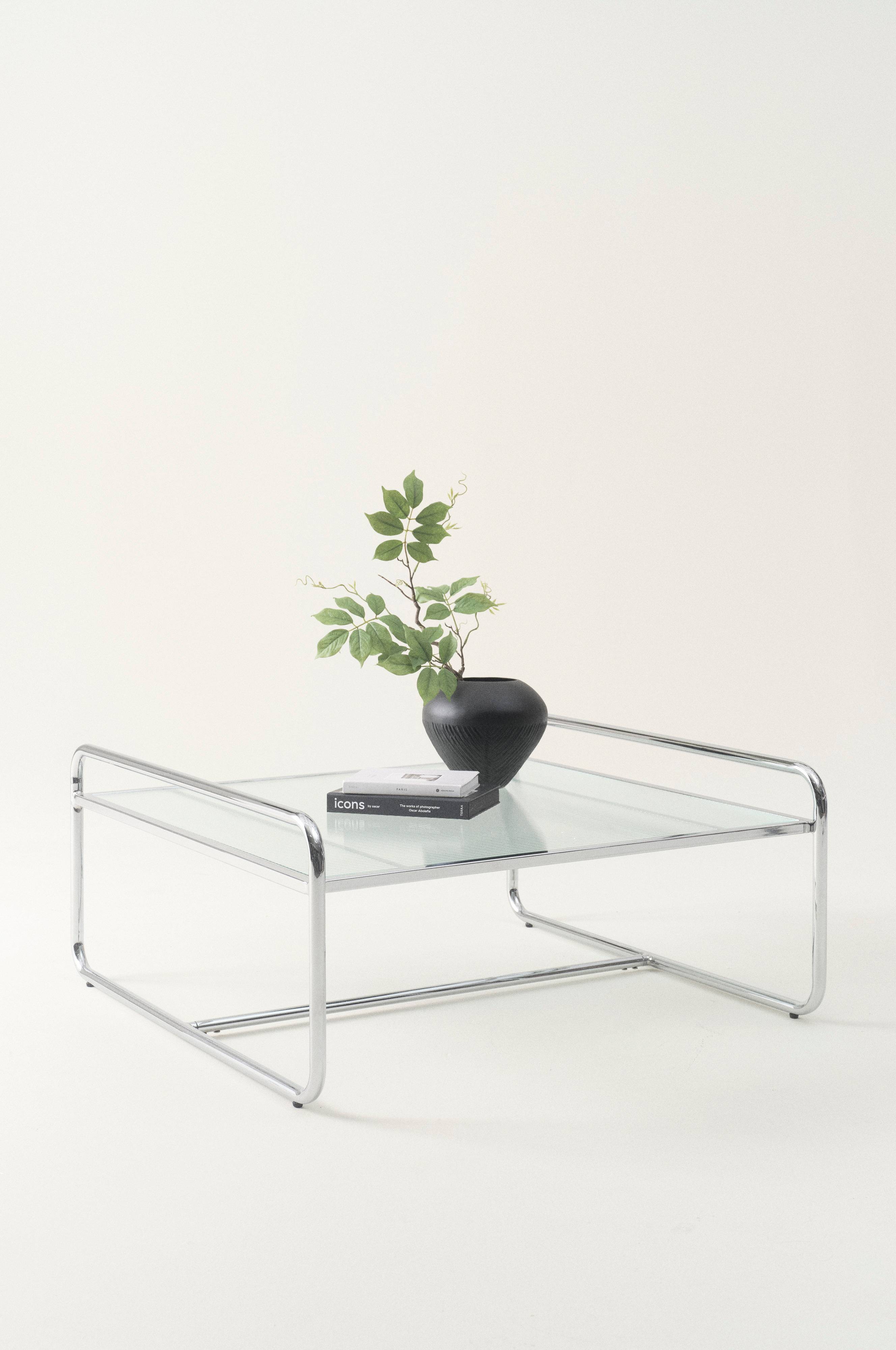 Storlek: Höjd 45 cm, 100x100 cm. Stålrör ø 3,2 cm. Tjocklek glas: 8 mm.