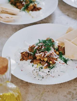 1. Sprid ut yoghurten på en tallrik och toppa med lammfärs, rädisor och dill.
