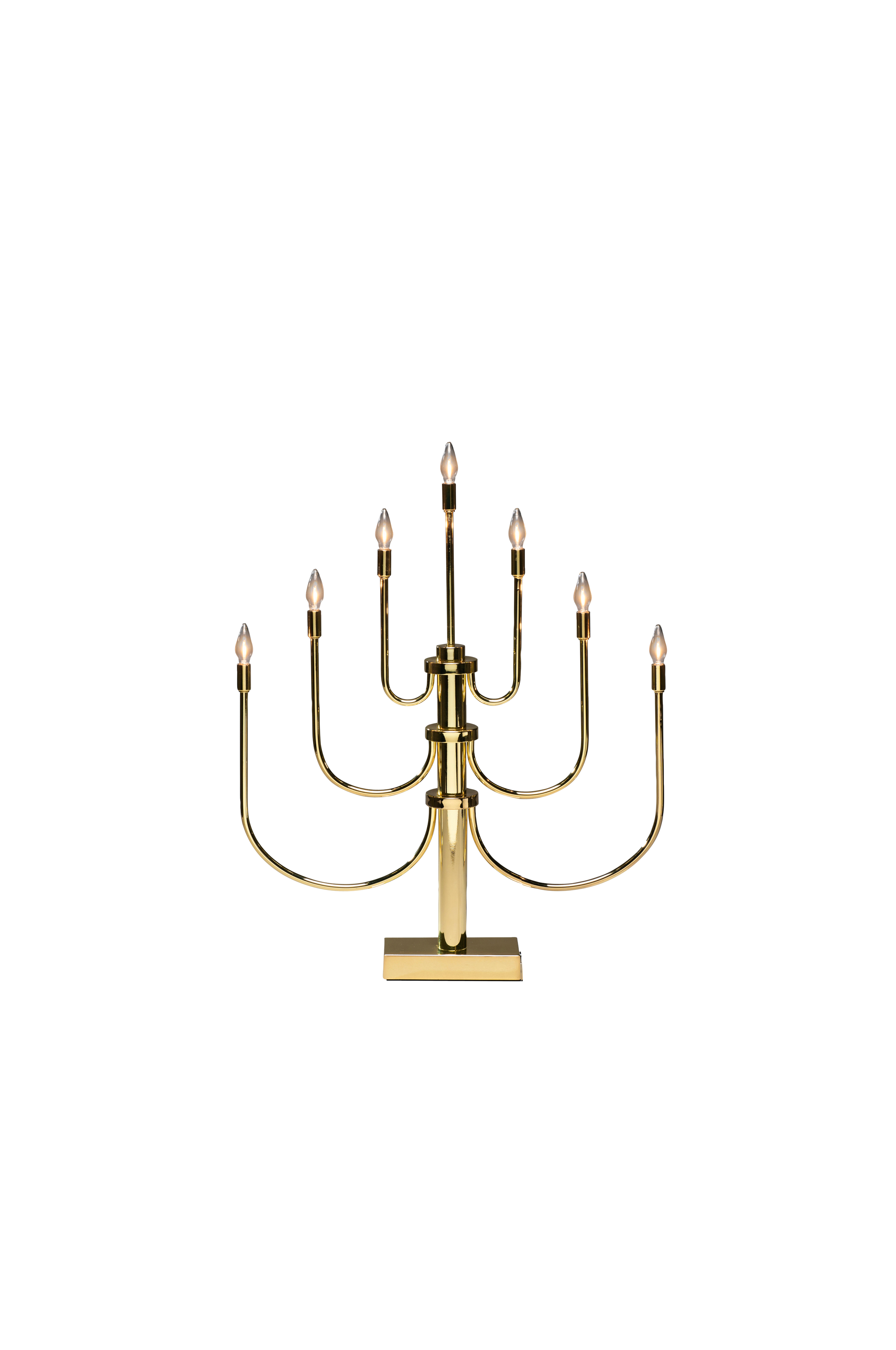 En 7-armad elljusstake i stål. Drivs med en 24v transformator. Anslutningssladd på 2,4 meter med sladdströmbrytare för manuell avstängning/påslagning. Höjd 55,5 cm och bredd 44,5 cm