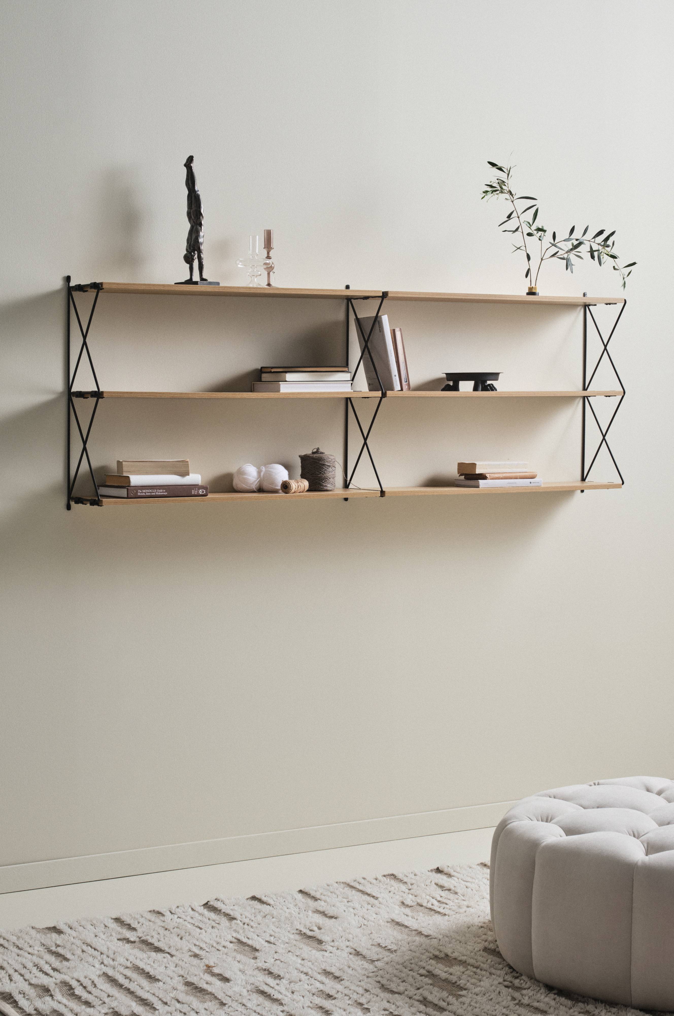 Denna hylla består av tre sidostag och sex hyllplan av MDF belagd med ekmelamin. Hyllorna har metallfästen på kortsidorna vilket gör att de hänger stabilt på sidostagen, samtidigt som du enkelt kan flytta dem. Viss montering krävs. Monteringsanvisning medföljer.
