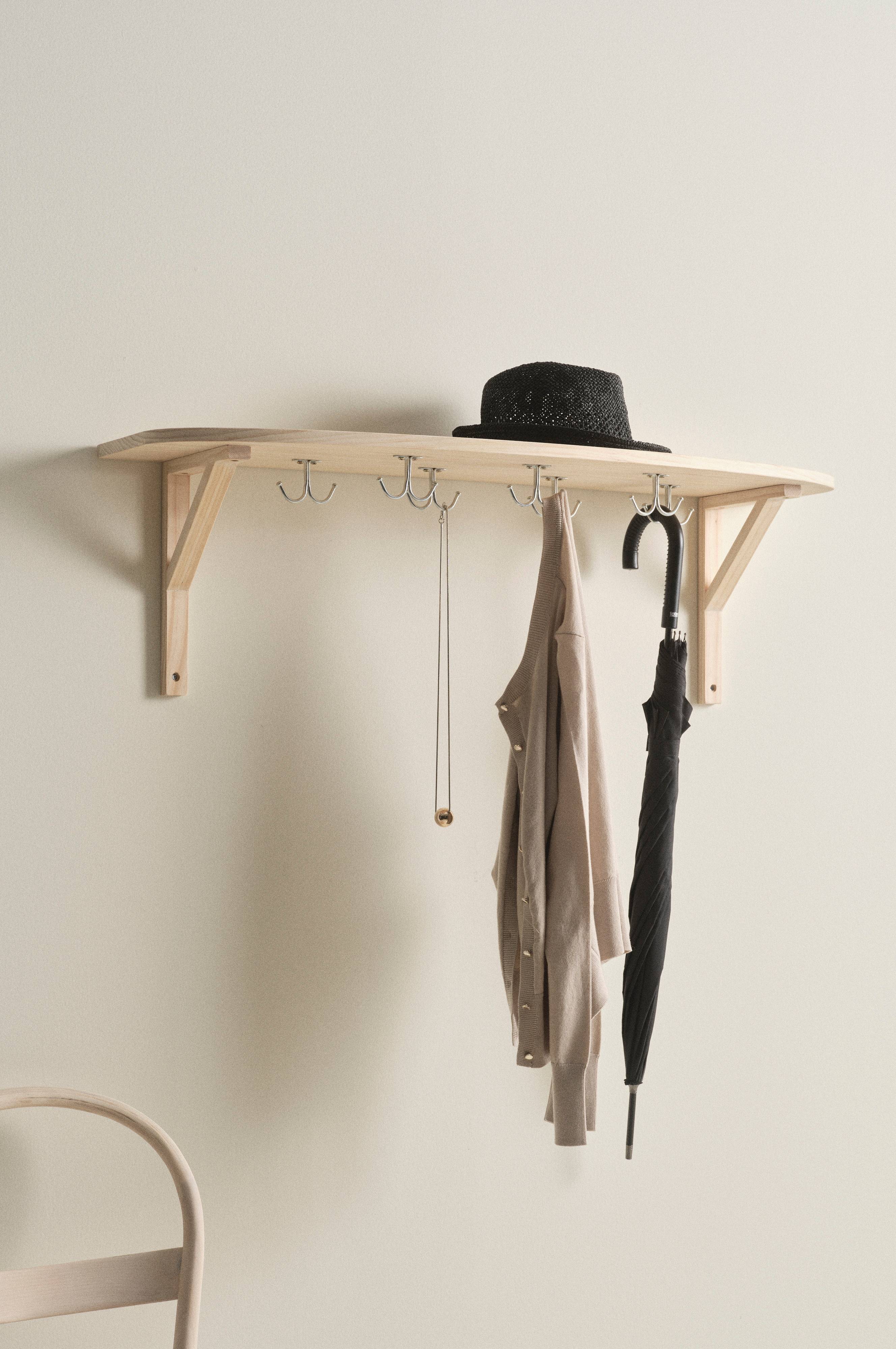 Handgjord hatthylla av FSC-certifierad, obehandlad furu med hängare av järn. Denna väggmonterade hatthylla är i stilren, nordisk design med en hylla som du fäster på två konsoller i väggen. Modellen är praktisk då skohyllan kan monteras på väggen i den höjd du önskar. Viss montering krävs. Monteringsanvisning medföljer.