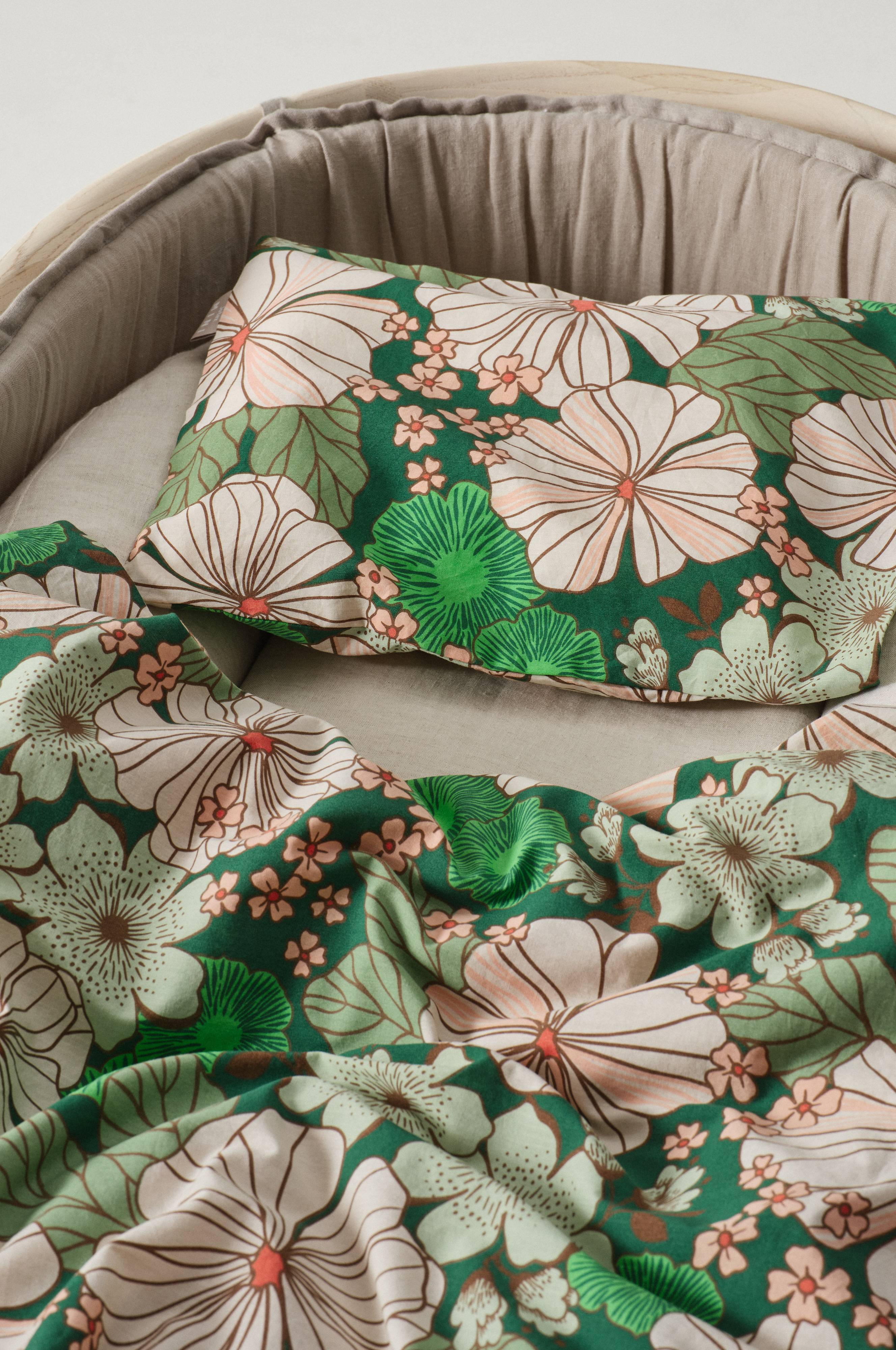 Påslakanset i två delar med ett påslakan och ett örngott i fintrådig, tätvävd bomullskvalité. Tyget har ett ljuvligt blommönster tryckt i skön färgskala. Det är också enzymtvättat vilket ger behaglig mjukhet och lite skönt sliten känsla. Setet passar till spjälsäng. .