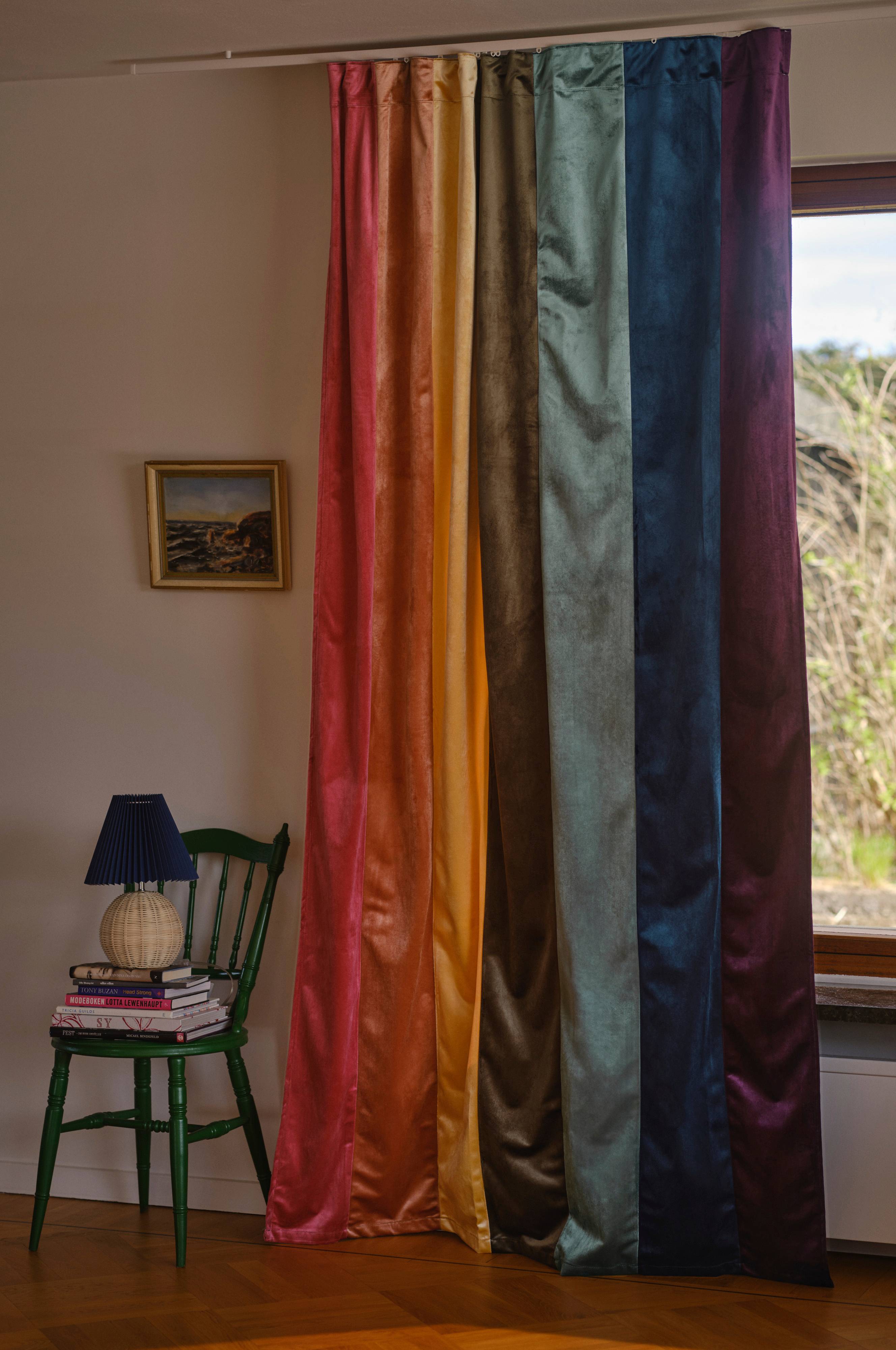 En randig gardinlängd i sammet. Sammet i vackra färger har sytts samman i vertikala ränder på ett effektfullt sätt. De ombonade gardinerna kommer att göra rummet extra höstmysigt. Med påsytt multifunktionsband. Gardinen kan hängas upp med fingerkrokar, kanal samt dold hälla.
