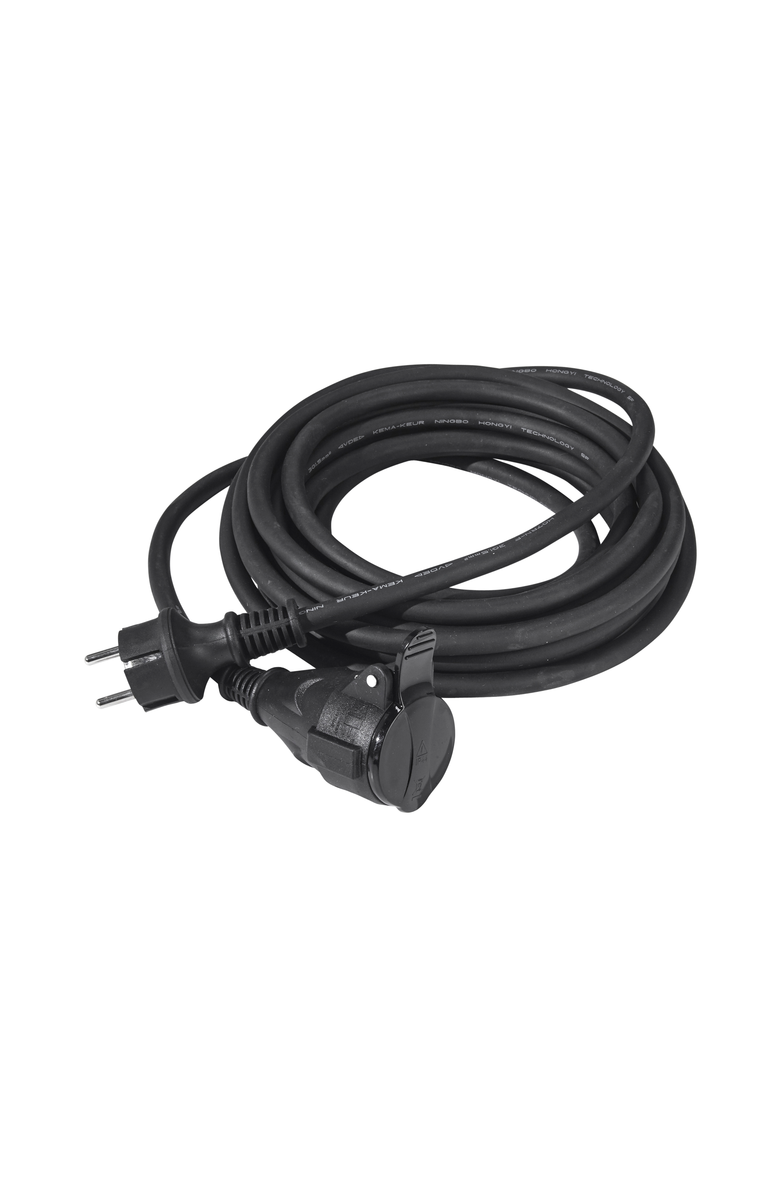 Förlängningskabel för utomhusbruk. Kraftig svart kabel i gummi med lock för uttag. Jordad. Max 40 W.