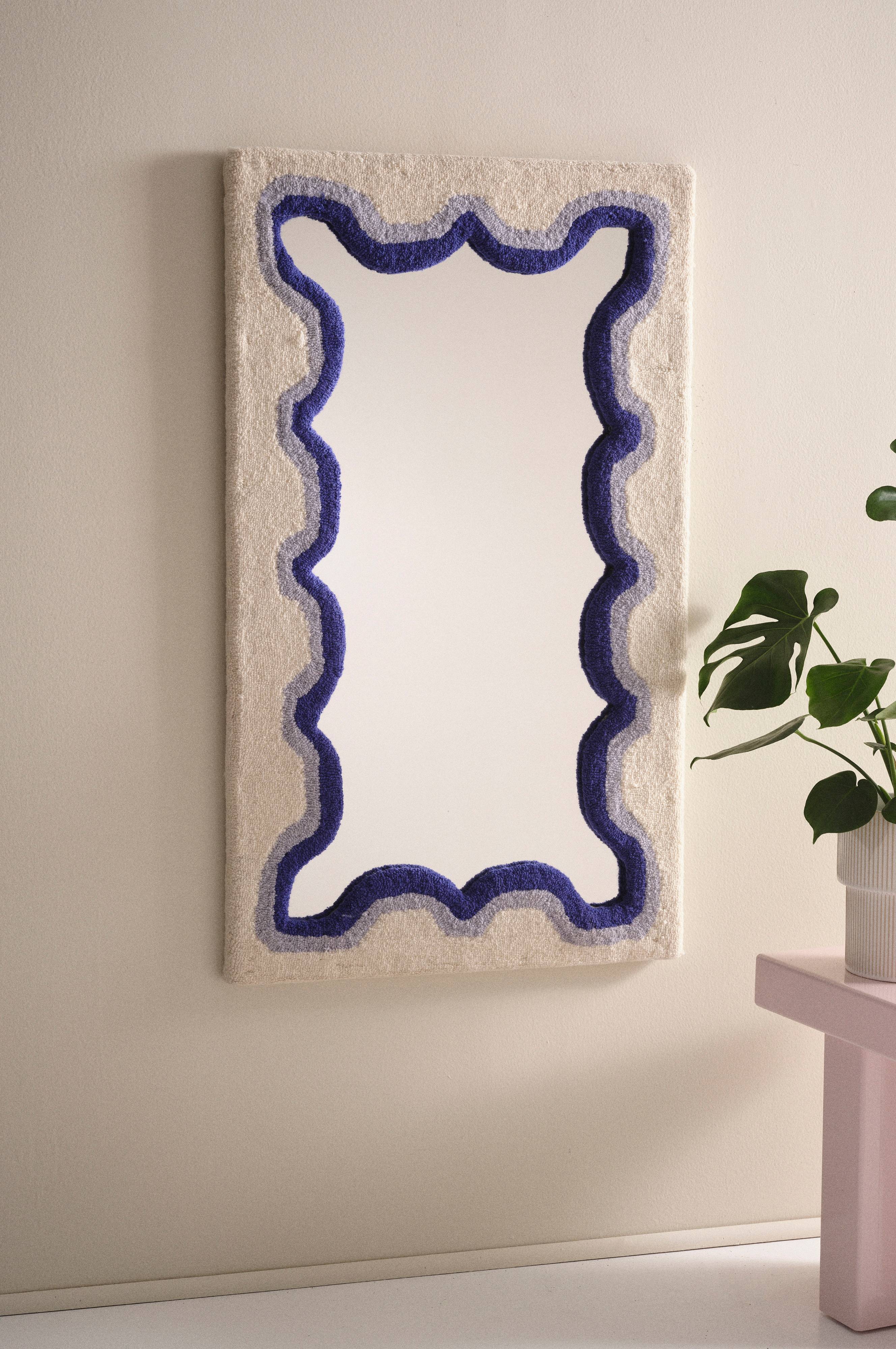 Spegel med läcker ram av MDF som är klädd med luggmatta av ull. Ramens innerkant har organisk, mjuk form och luggmattan som klär ramen är trefärgad. Spegeln kan hängas både stående och liggande, vilket som passar dig bäst. Baksidan är av MDF.