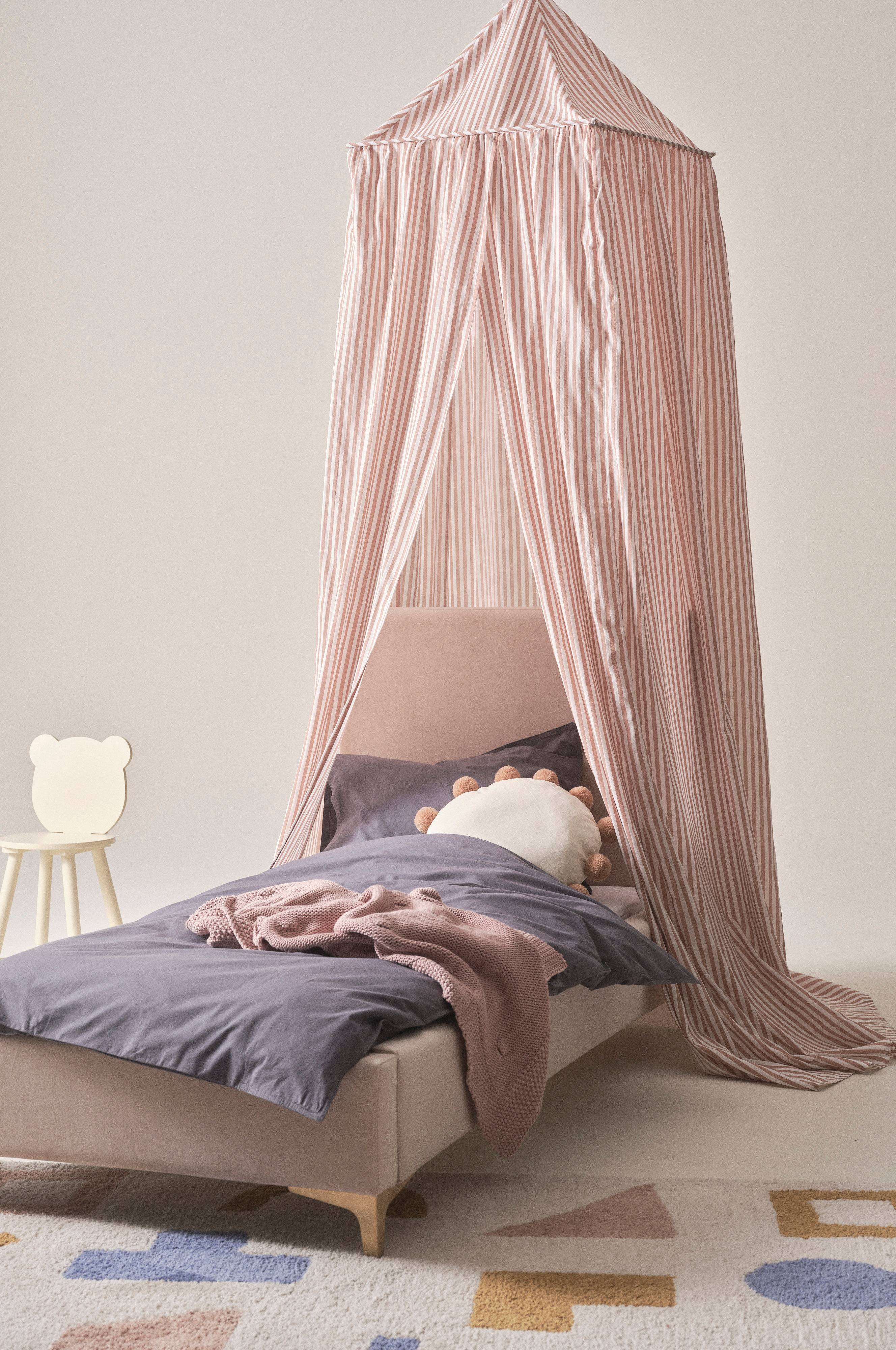 Sänghimmel i följsamt polyester- och bomullstyg med tryckt randigt mönster. Denna sänghimmel är kvadratisk upptill och öppen framtill. En sänghimmel över barnens säng skapar en ombonad atmosfär, det kan bli lite extra mysigt att gå och lägga sig. Mönsterbilden FRANNY finns i många olika delar så att du kan inreda barnkammaren med ett randigt tema.