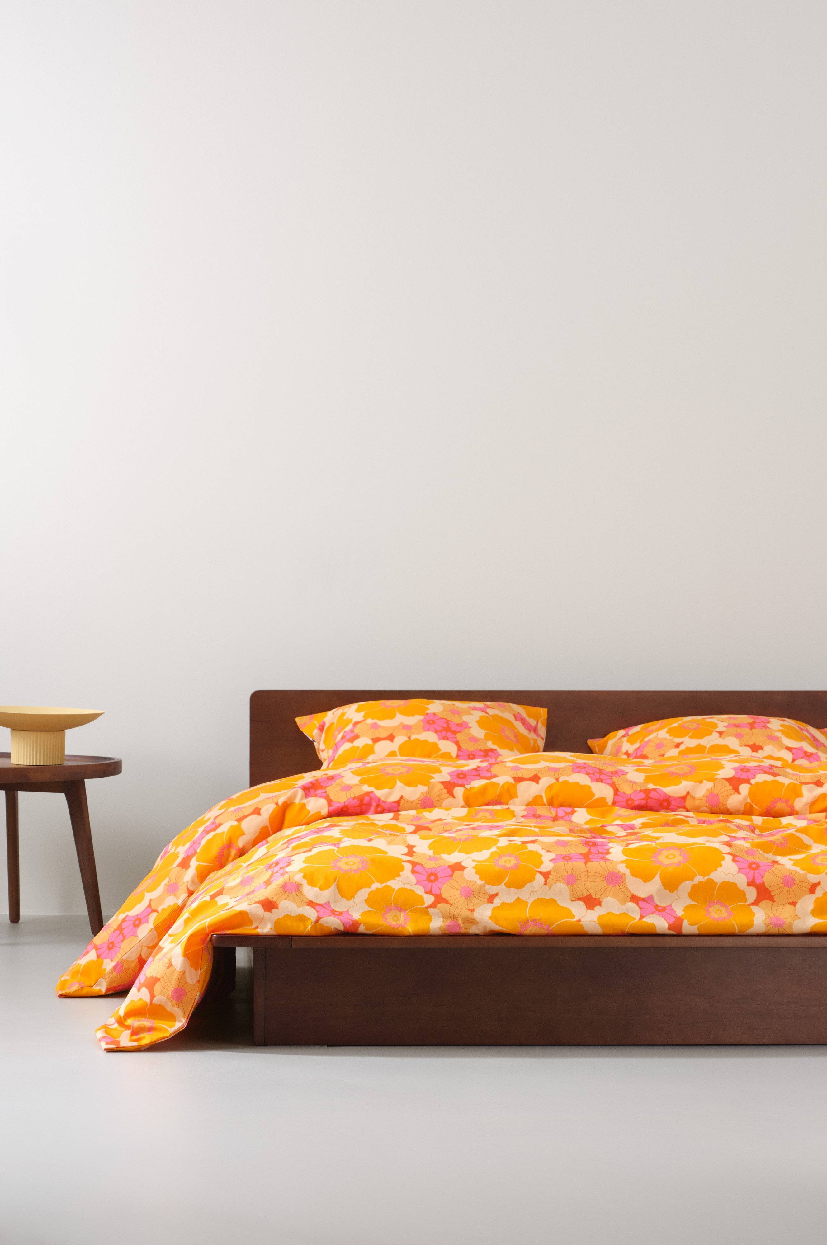 FRIDA dubbelsängset har ett fängslande retroblommönster designat av Maria Carlberg, vilket ger en livlig touch till ditt sovrum. Det här tredelade setet är tillverkat av ekologisk bomullspercale och innehåller ett extra brett påslakan och två örngott, vilket garanterar andningsförmåga och komfort för en vilsam natts sömn. FRIDA är genomtänkt designad med handtag på långsidorna och dolda tryckknappar nedtill och erbjuder en blandning av bekvämlighet och stil, perfekt för trendiga interiörer.