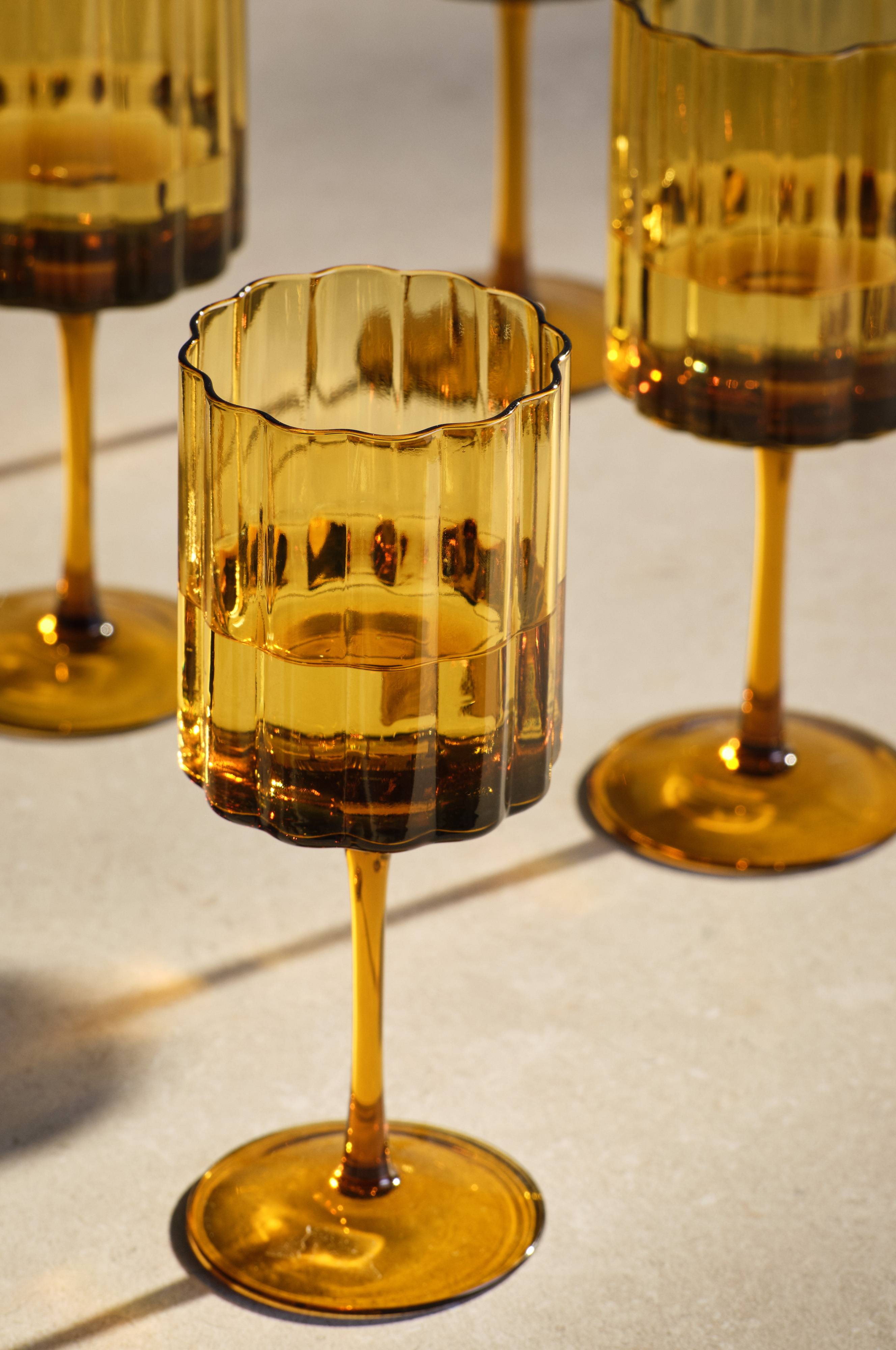 FUMA vinglas set har vågiga kanter som ger en retrokänsla till ditt bord. Detta paket med fyra glas erbjuder ett elegant sätt att njuta av dina favoritviner, vilket gör att varje klunk känns speciell. Perfekt för att underhålla gäster eller förhöja vardagens matupplevelser med en gnutta nostalgisk charm.