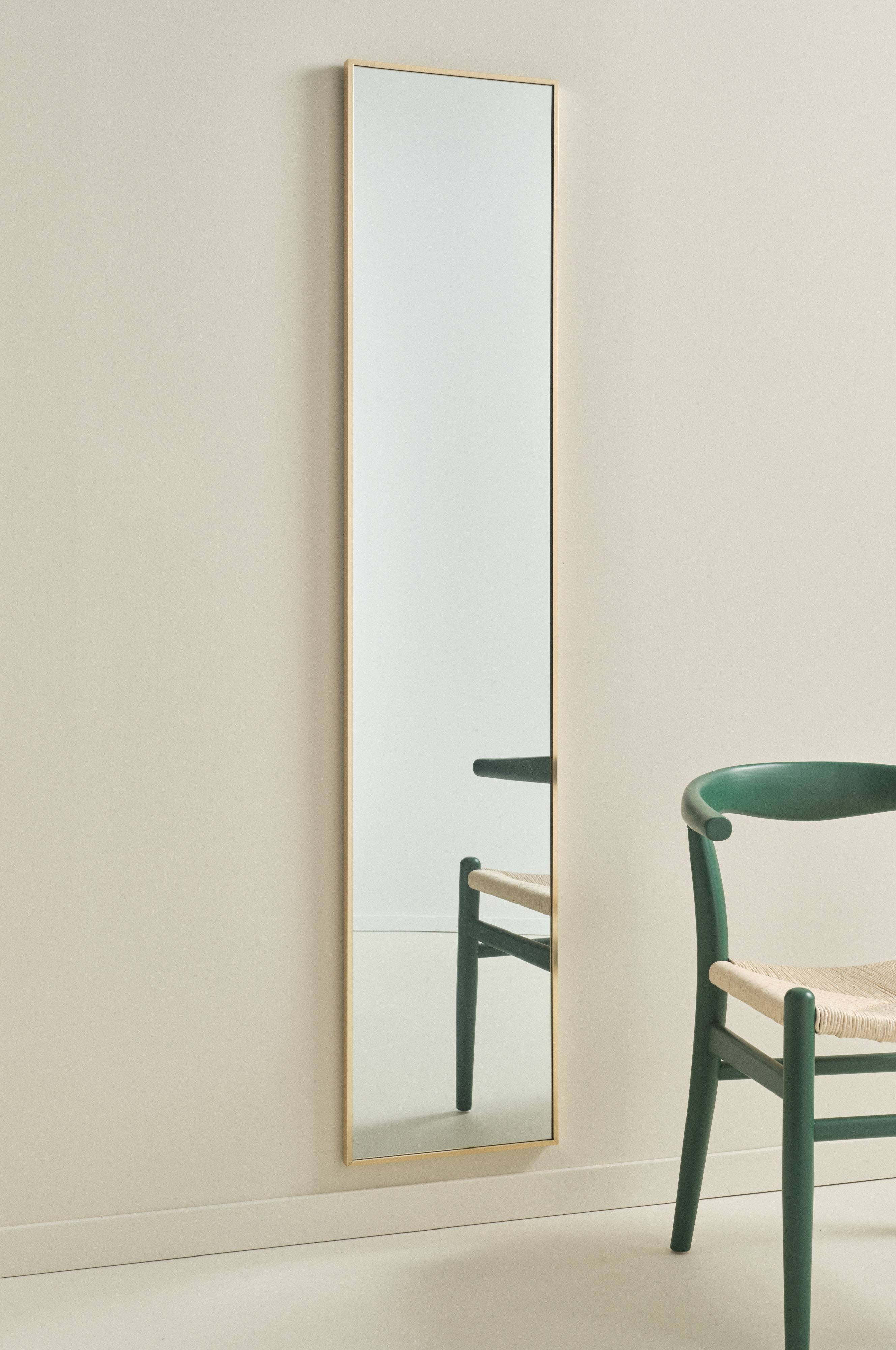 Rektangulär spegel med smäcker aluminiumram. Ramen har dold förstärkning av MDF. Tre dolda hängare på baksidan, så spegeln kan hängas både vågrät och lodrät.