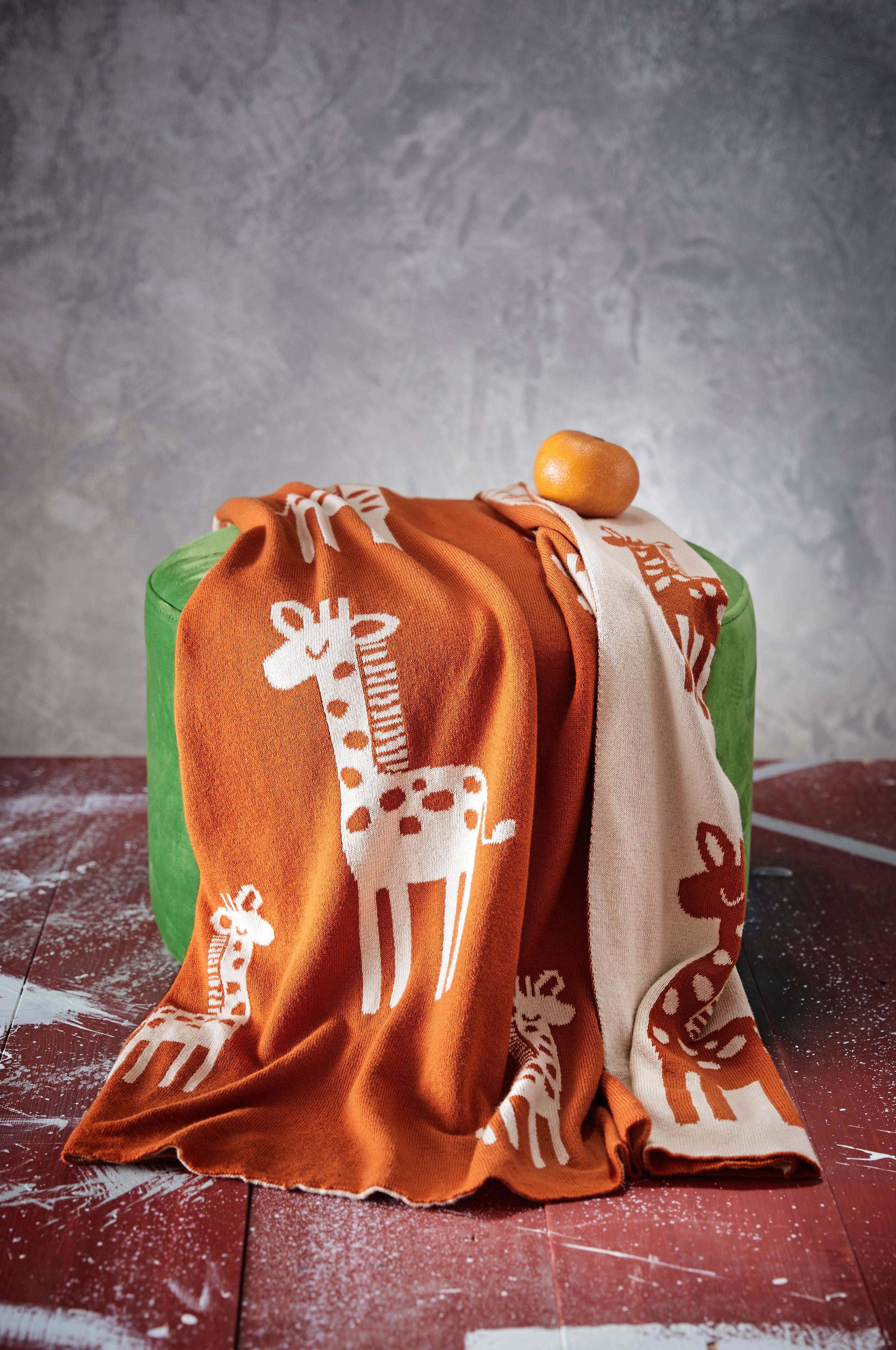En mysig och mjuk stickad babyfilt i ekologiskt bomull med små dekorativa giraffer. Passar perfekt att ha i barnvagnen och spjälsängen.