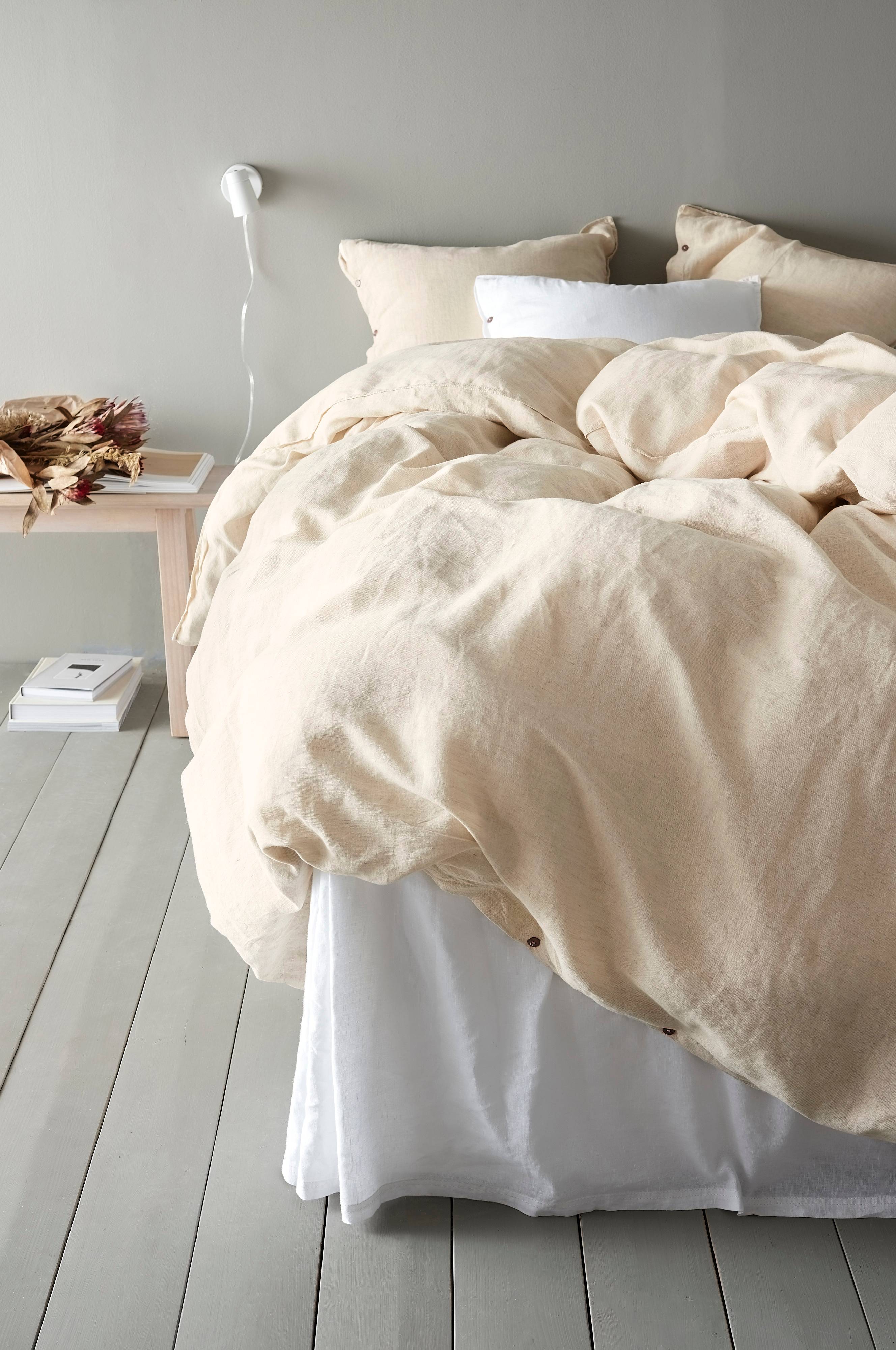 Påslakanset i 3 delar av plaggtvättad lin- och bomullsblandning. Dubbelstickade sömmar och knappar för tillslutning. Trådtäthet på 92 tc. (Trådtätheten talar om antalet trådar, thread counts, per kvadrattum i ett tyg. Ju högre trådtäthet desto högre kvalité. Linne och linnemix vävs ofta lite glesare för att få den rätta känslan.)