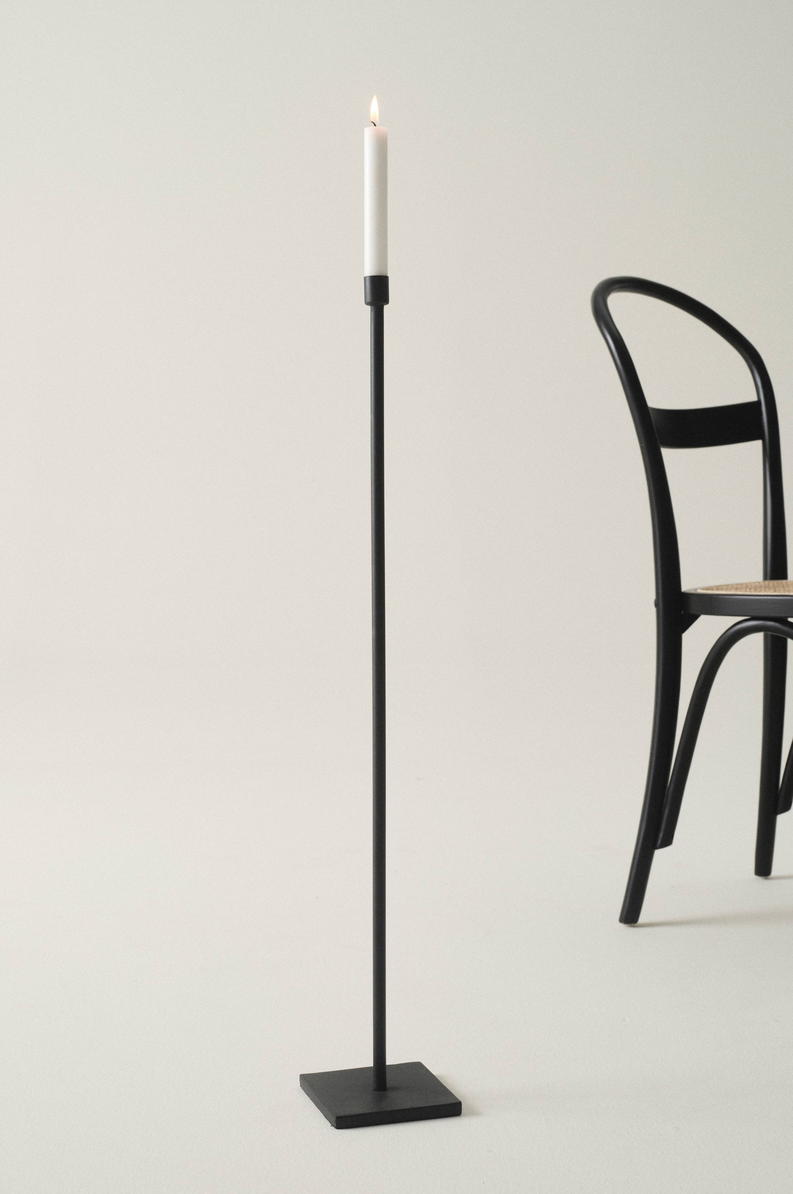 Golvljusstake av järn. Ljusstaken är hög och rak med skön enkelhet, Foten är fyrkantig och ljusstaken har matt svart pulverlack. Flera golvljusstakar i grupp blir ett snyggt inslag i vardagsrummet. Ljus medföljer ej.