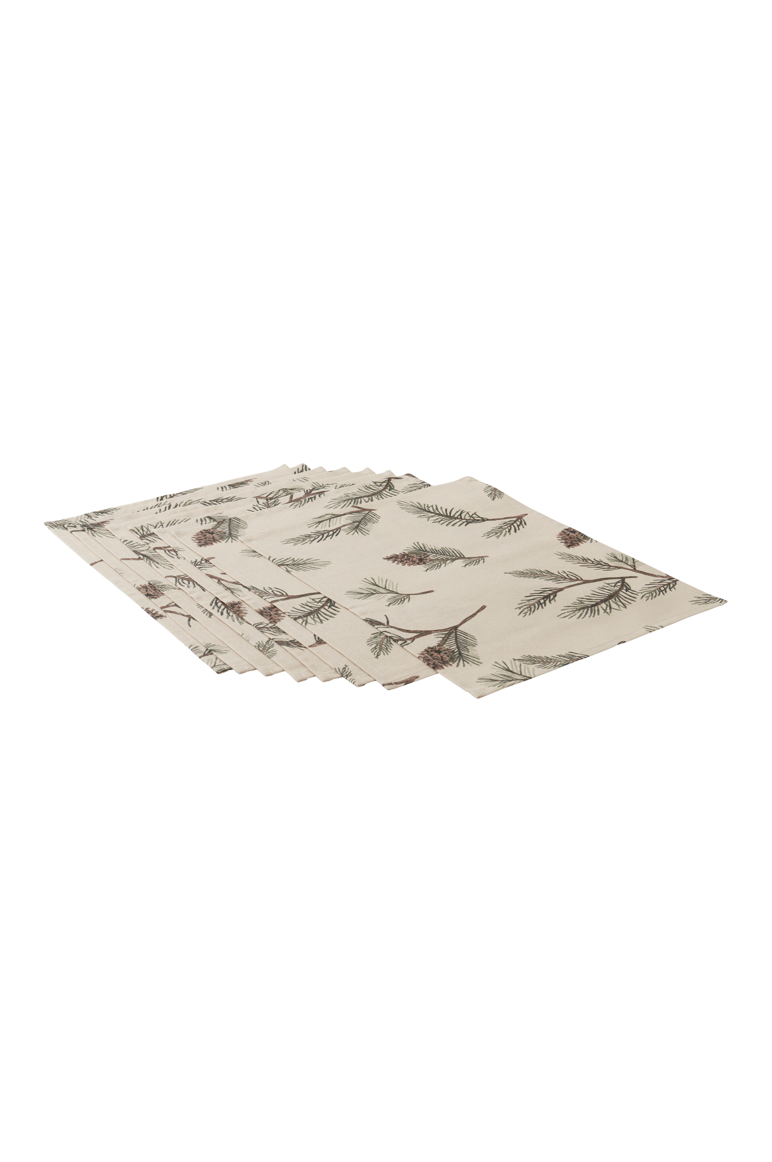 8-pack bordstabletter i kraftig och samtidigt lite glesare vävd bomull. Kottar och barr ger mönstret HOLLY sin härligt naturliga känsla, mönstertrycket har inspirerats av våra vackra skogar och skapar härlig stämning till jul, men gör sig lika fint hela året.