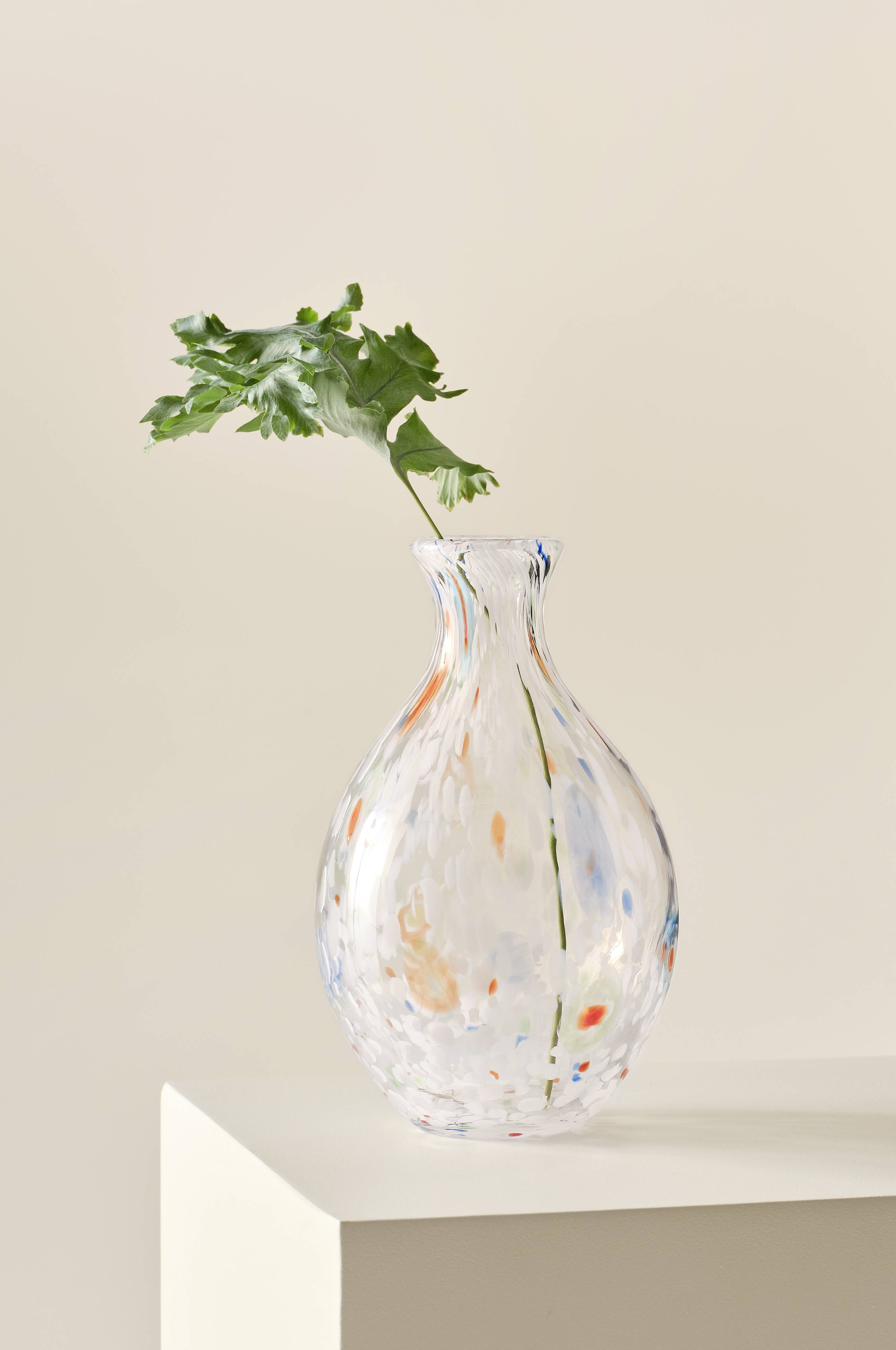 HONEY vas i klarglas med mestadels vita och färre oregelbundna prickar i flera färger. Den här glasvasen lyfter fram dina blommor på ett vackert sätt. Varje vas är handgjord, vilket garanterar ett unikt mönster på varje vas.