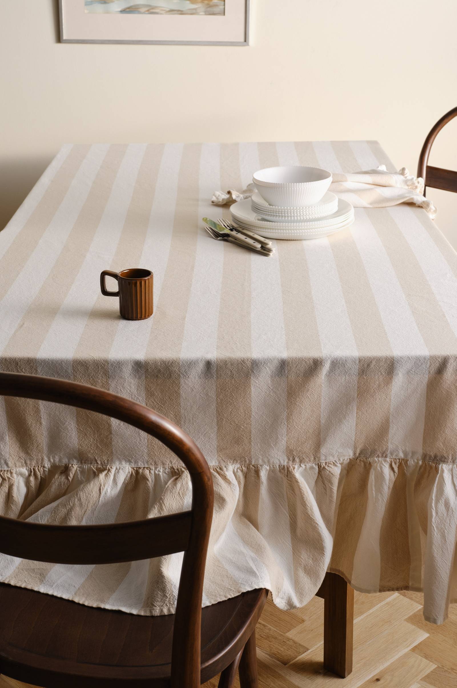 Bordsduken ISLA förgyller ditt kök med sin charmiga randiga design och vackra volang. ISLA är designad för vardagsbruk eller speciella tillfällen och ger din dukning ett inbjudande utseende. ISLA-duken tillför en klassisk och mysig känsla till ditt kök, vilket gör varje måltid till en härlig upplevelse.